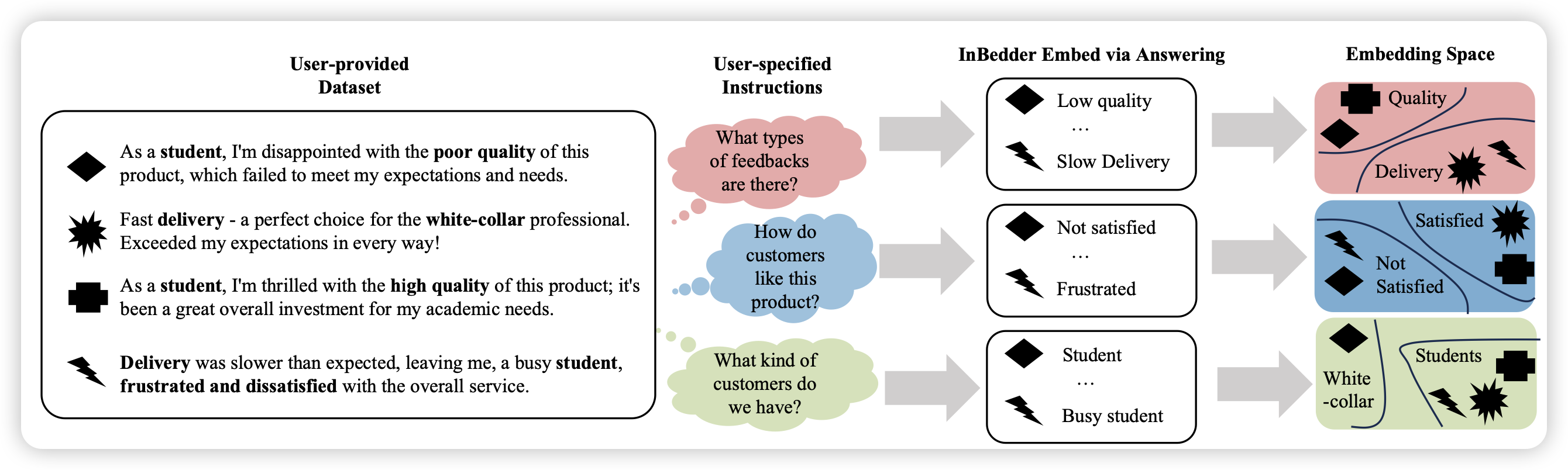 作者对于text embedding建模想到了一个简单的框架:如果找embedding是为了使用,那么不妨直接用QA的形式组织text embedding的表示。并且在instruction-aware的测试中取得了较好的效果