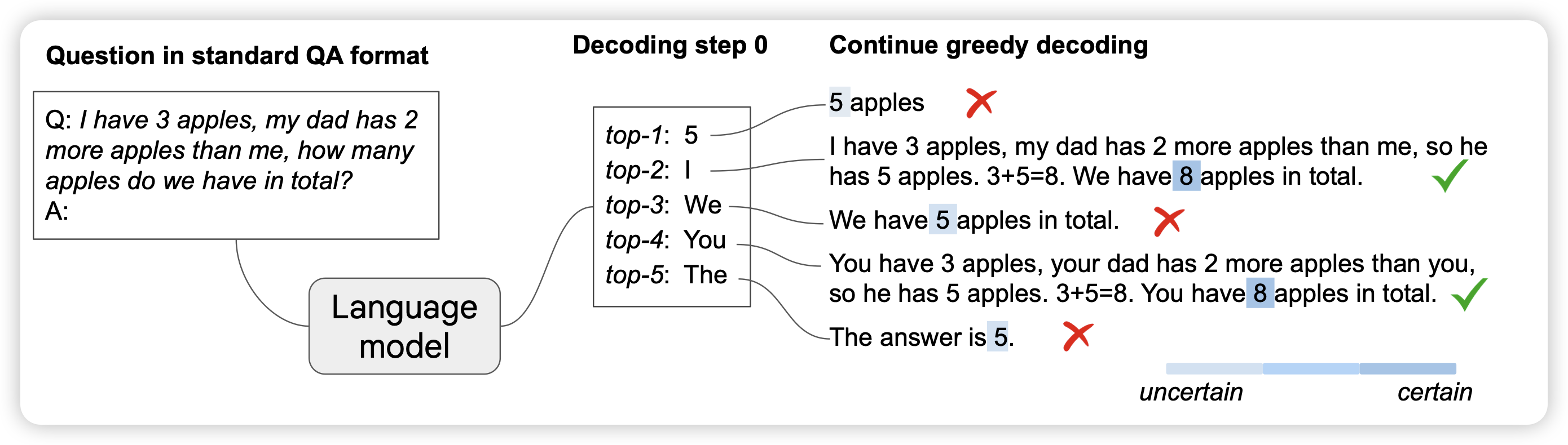 Denny Zhou的论文:作者尝试了在解码时不使用prompt技巧鼓励模型用CoT,而是直接通过解码算法让模型使用CoT。作者发现通过这种方法激发出来了CoT能力其实也很好,而且可以使用不同的reasoning module去完成任务。
