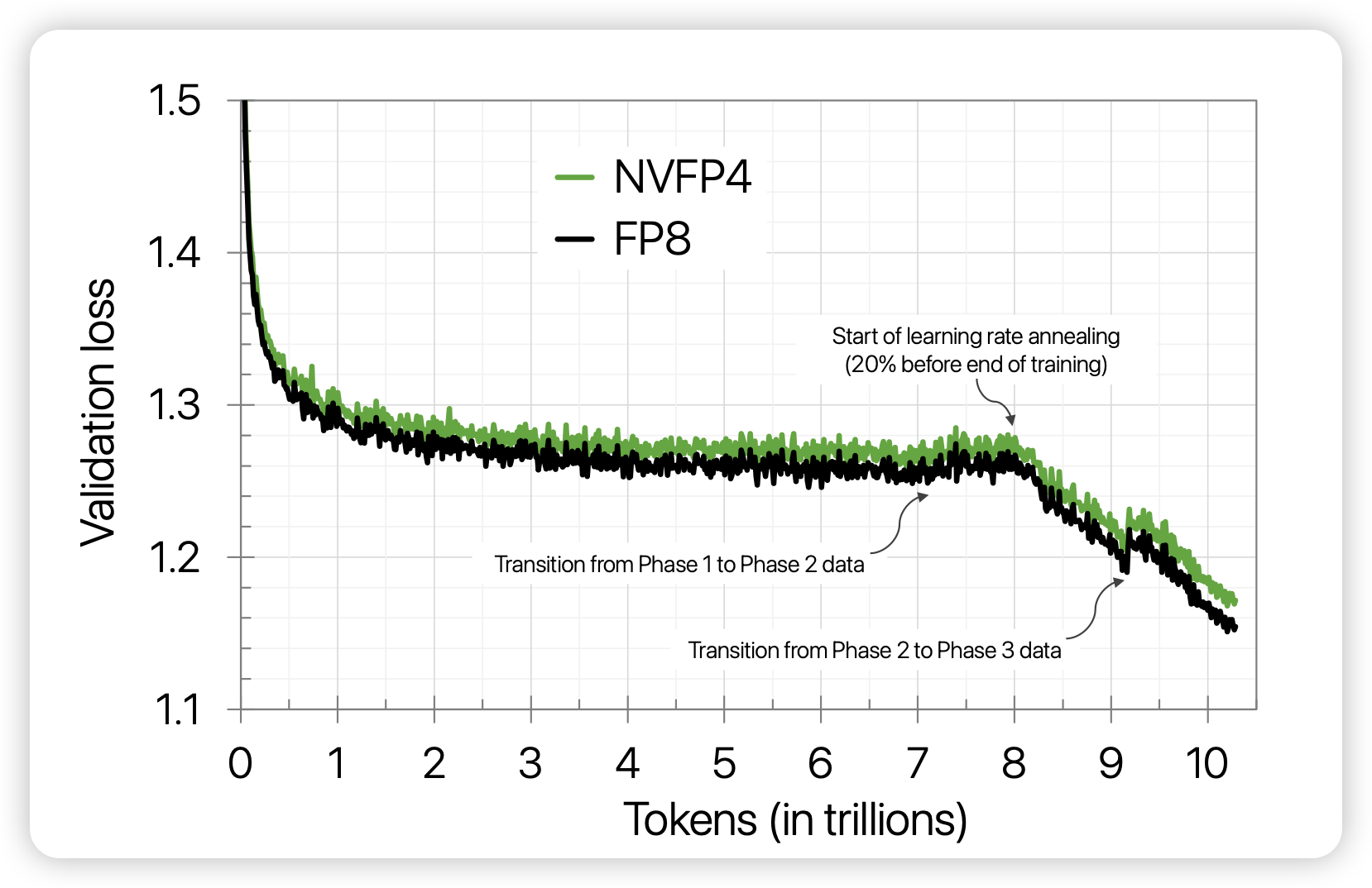 一篇nvidia秀肌肉的文章,但是肌肉确实大。当中国芯还在对接w4a8时,nvidia直接做了fp4的训练(不是量化推理)。为了证明他们真的能训,他们甚至训了10T token