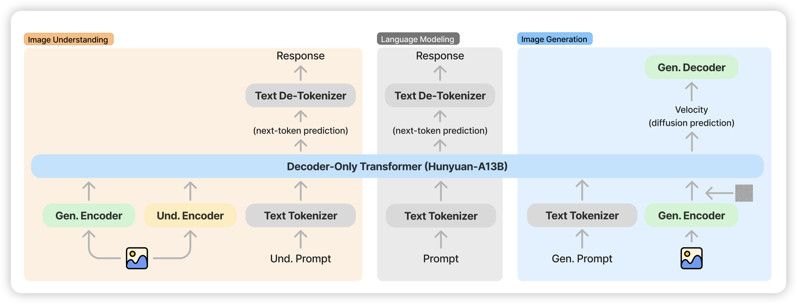 腾讯出的生成理解统一模型,类似于古老的janus结构,用了两种image encoder,总体decoder部分做成了80A13的级别