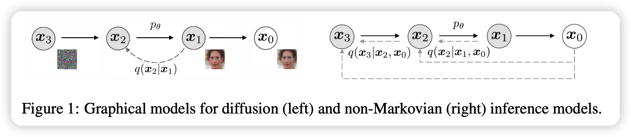- DDPM中的loss\(L_\lambda\)只依赖于\(q(x_t|x_0)\),和\(q(x_{1:T} |x_0)\)无关。这样符合边缘分布的可能性有很多,作者选取了一个非马尔科夫的过程