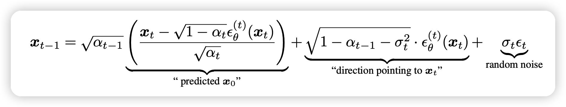 这个式子里面只有最右边的部分是带有随机成分的。而且当 \[ \sigma_t = \sqrt{(1 − \alpha_{t−1})/(1 − \alpha_{t})}\sqrt{1 − \alpha_{t}/\alpha_{t-1}} \] 时退化为DDPM