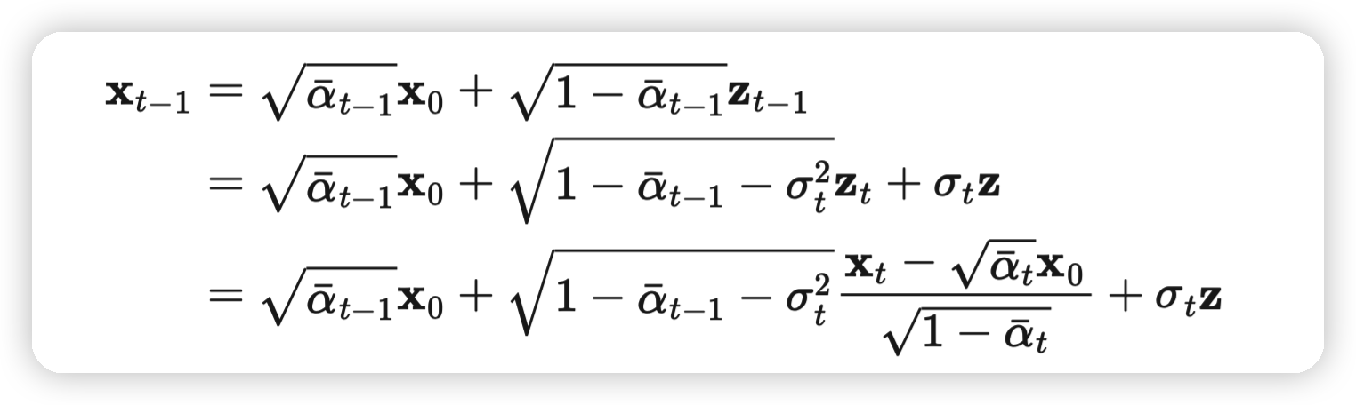 反向的公式是: \[ q(x_{t−1}|x_t,x_0) = N(x_{t−1};μ_t(x_t,x_0),\hat{\beta_t} I), \] 其中 \[ \text{均值:} \mu_t(x_t,x_0) = \frac{ \sqrt{ \overline{\alpha_{t-1}} }\beta_t }{1 - \overline{\alpha_{t}}} x_0 + \frac{\sqrt{\alpha_t} (1 - \overline{\alpha_{t-1}} )}{1 - \overline{\alpha_{t}}} x_t \\ \text{方差:} \hat{\beta_t} = \frac{1 - \overline{\alpha_{t-1}}}{1 - \overline{\alpha_{t}}}\beta_t \]