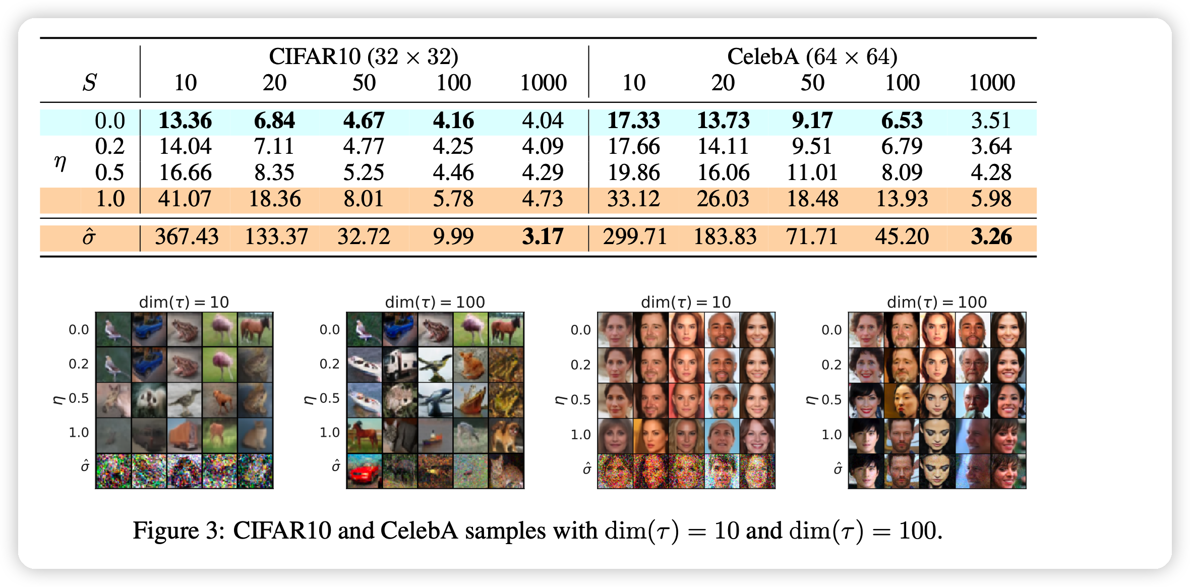可以看出,DDIM在步数少的时候表现最好。最下面那个\(\hat\sigma\)代表原始的DDPM祖先采样。可以看出,衰减非常明显