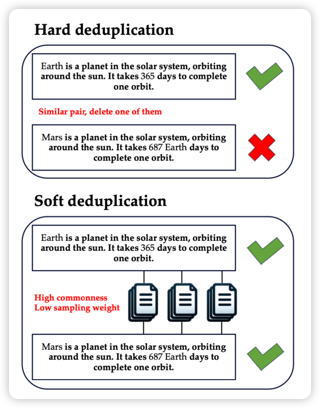 一篇讲预训练数据选择的论文。作者这里发现,已有的方法对于语义重复的数据往往是删掉其中一个(去重),这里作者想的是能不能降低sample概率。作者发现这种soft的去重,会比正常的去重训练数据高很多