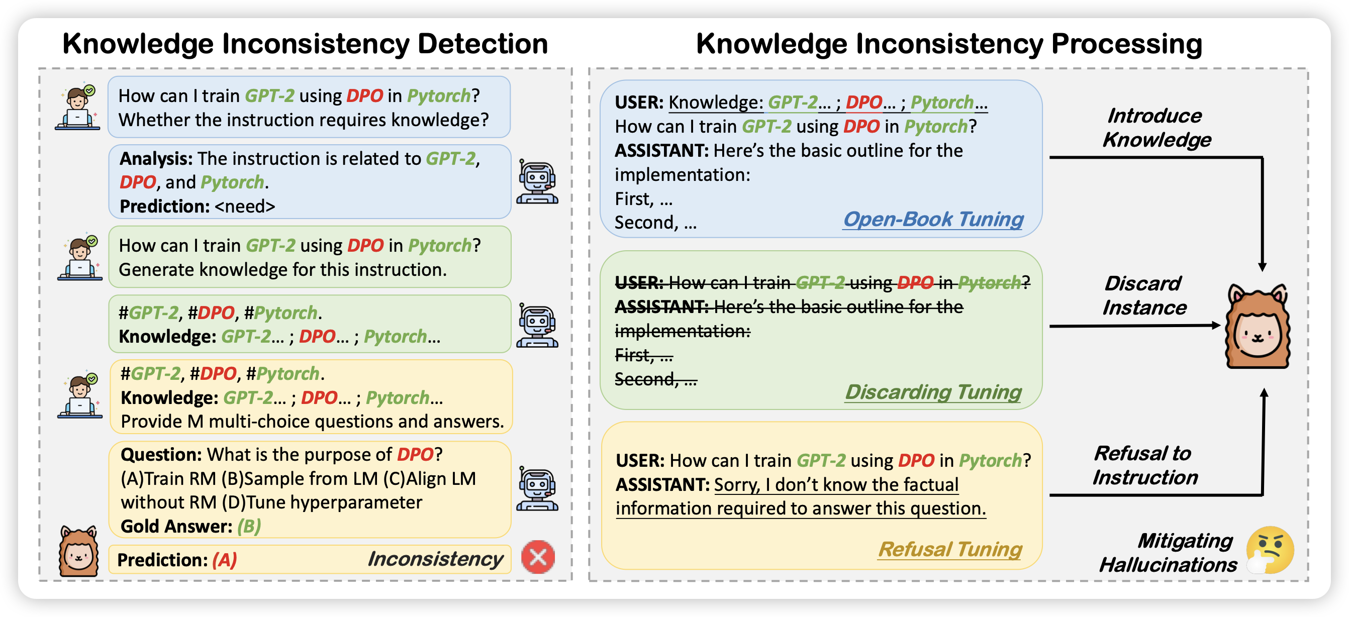 - 根据llama能不能达出来的情况,判断这条SFT数据的知识和固有知识是不是冲突的。进而将SFT数据处理成"sorry message"之类的不同形式
