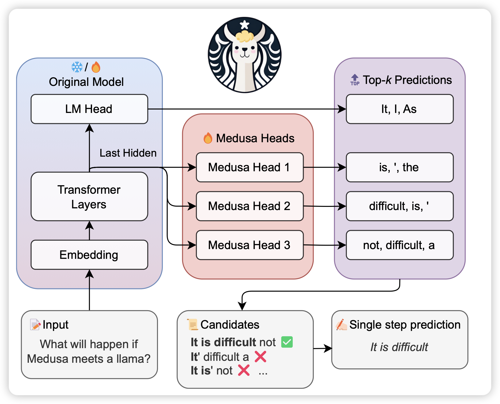 解码加速research line,作者认为传统的投机推理需要额外的draft model。作者的想法是能不能让一个模型有多个decoding head做并行,然后用某种方法验证一个最长接受子串,得到比投机推理更快、参数更少的办法