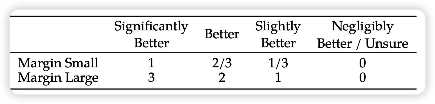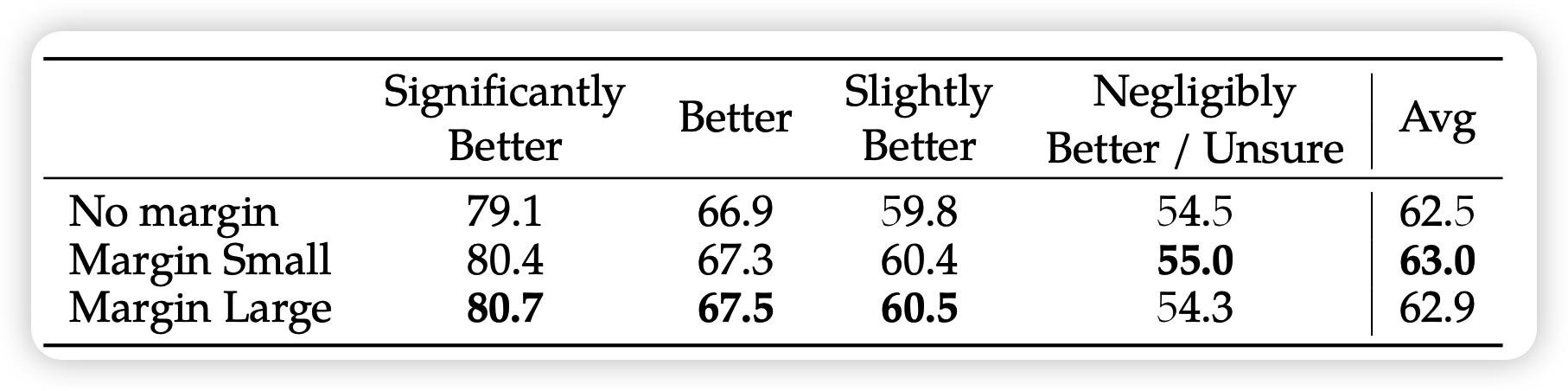 如果已知human的偏序不止一种的话,就可以额外加一点偏差值 \[ \mathcal{L} = - \log(\frac{1}{1 + e^{-(r_\text{good} - r_\text{bad} - \text{margin})}}) \] 就是说,比如significant better,就希望差得更远,通过更大的gradient来保证。作者做了消融实验,看在测试集上reward model的分类acc,发现效果确实更好