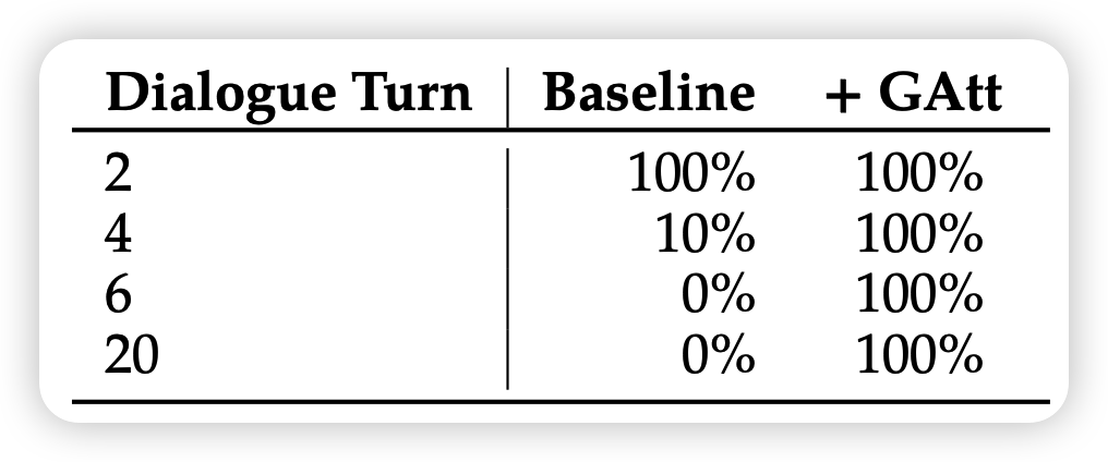 可以发现,不加GAtt,基本上两轮以后前面的prompt已经忘完了,加上以后就一直不忘。