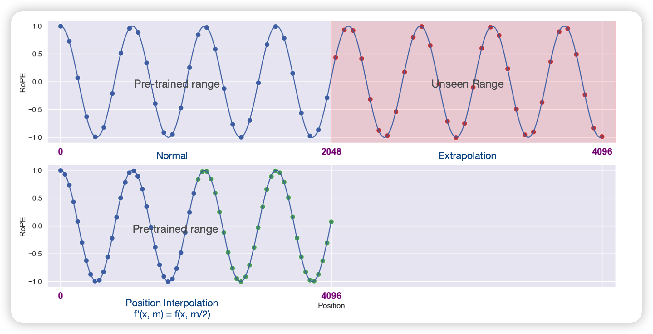 答案是可以。 \[ f'(x,m) = f(x, m \frac{L}{L'}) \] 其中x是word embedding,m是位置。对于一个超过之前最大距离L的样本(距离为L'),通过内推将所有位置映射回L区间,每个位置都不再是整数。通过这种方式在长样本区间训练1000步,就能很好的应用到长样本上