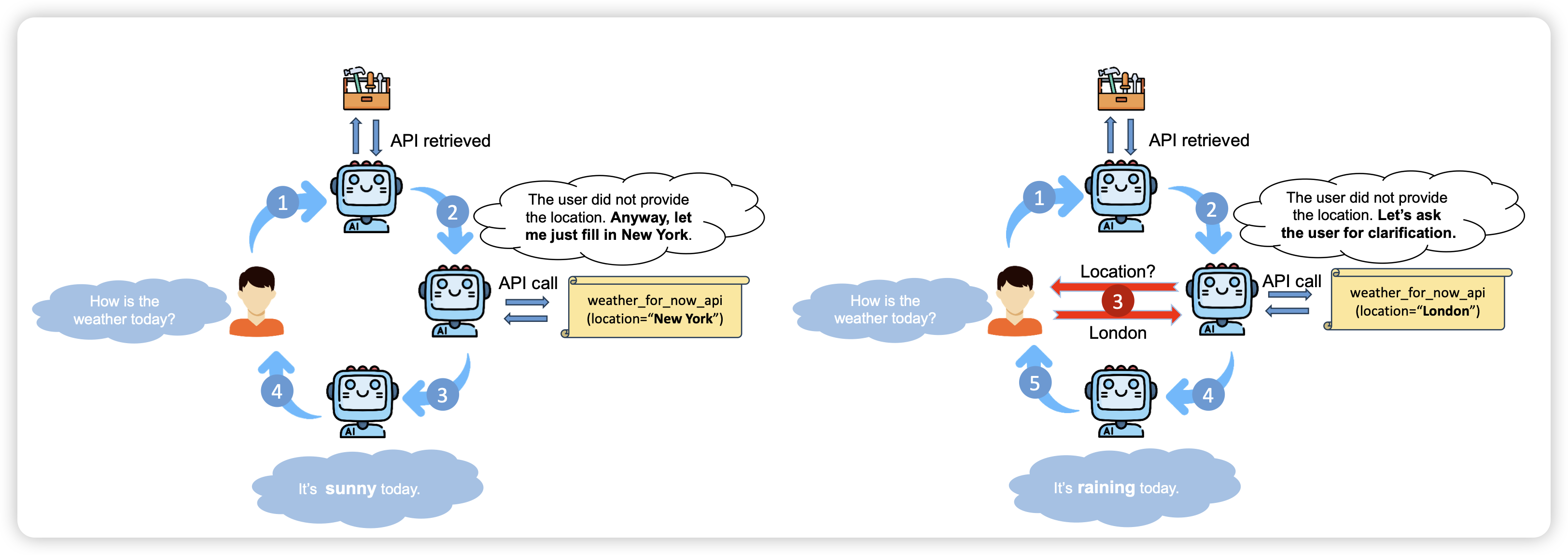 挺有趣的工作,作者认为:在真实场景中,用户的instruction往往有歧义、或者不明确,模型应该正确地发现歧义,或者主动在任务进程中问用户相关的信息。作者探索了在tool场景中模型能否获得这个能力