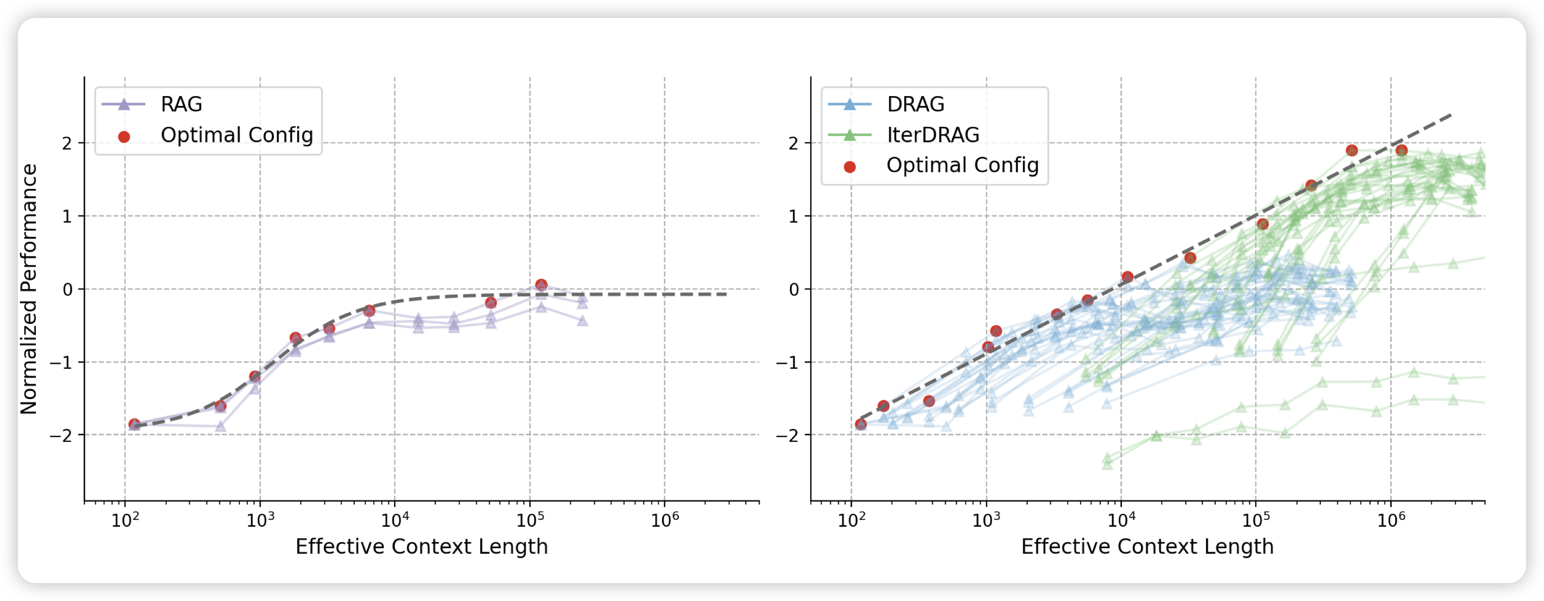 Deepmind的工作:作者结合了之前的many-shot ICL,认为其是RAG的inference-time compute领域的一种scaling方案。另一种方案是使用不同的RAG prompt抽取很多次做一堆infer。对于每个query,都可以使用这两种方案做各种实验,比如100-shot,或者用10个rag prompt做10次10-shot拼成一个100-shot,总体budget一致。作者经过研究,发现如果给所有budget做到optimal的情况下,performance和context-length是可以符合scaling law的