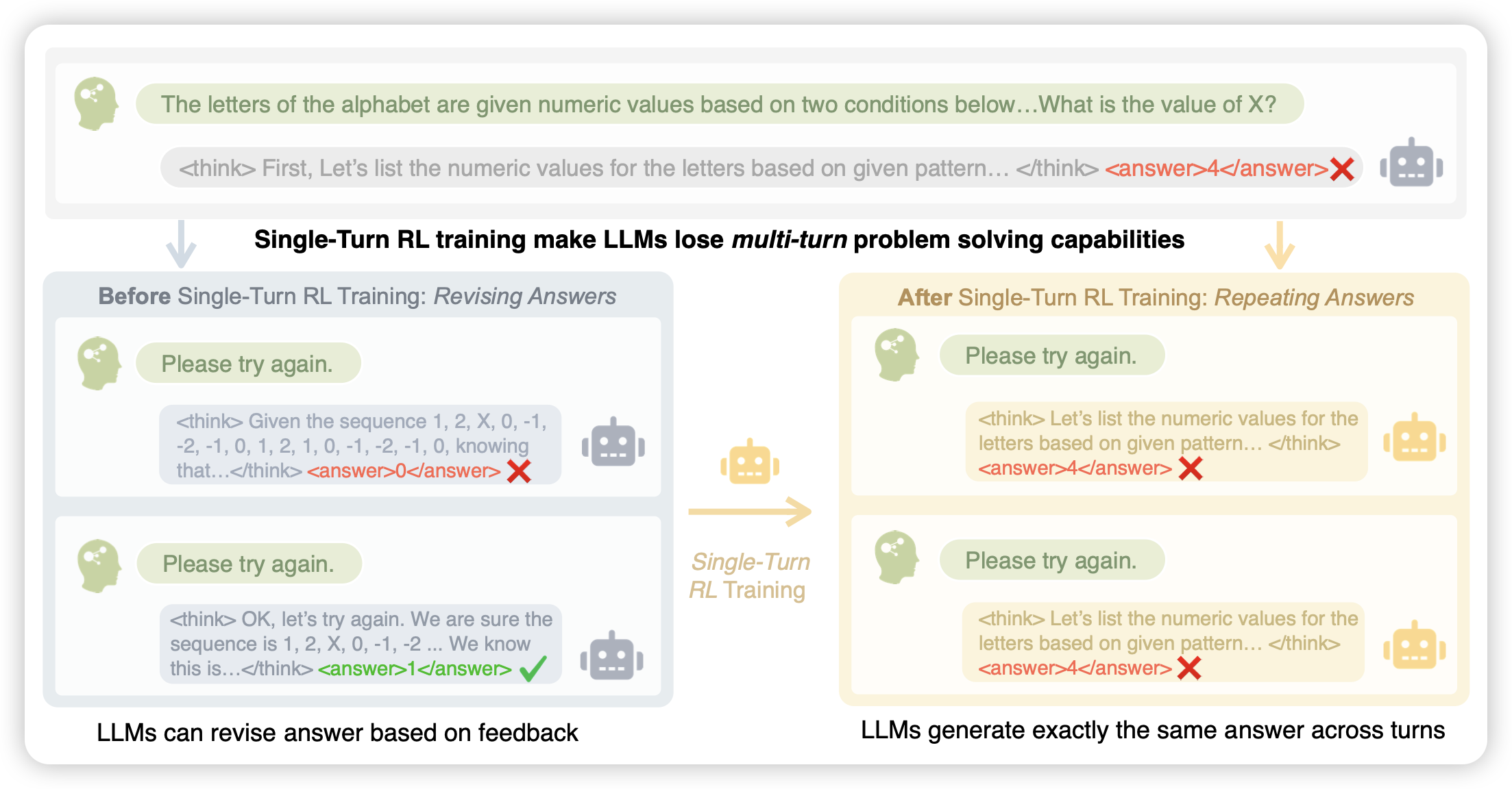 这篇工作有点好玩。作者发现传统的单轮rl,越训练模型在多轮上的表现越差。所以作者来了个multi-try,如果第一轮做错就让模型继续做,如果做对就结束。然后try time越多得分越少,通过这种方法来提升多轮的效果。