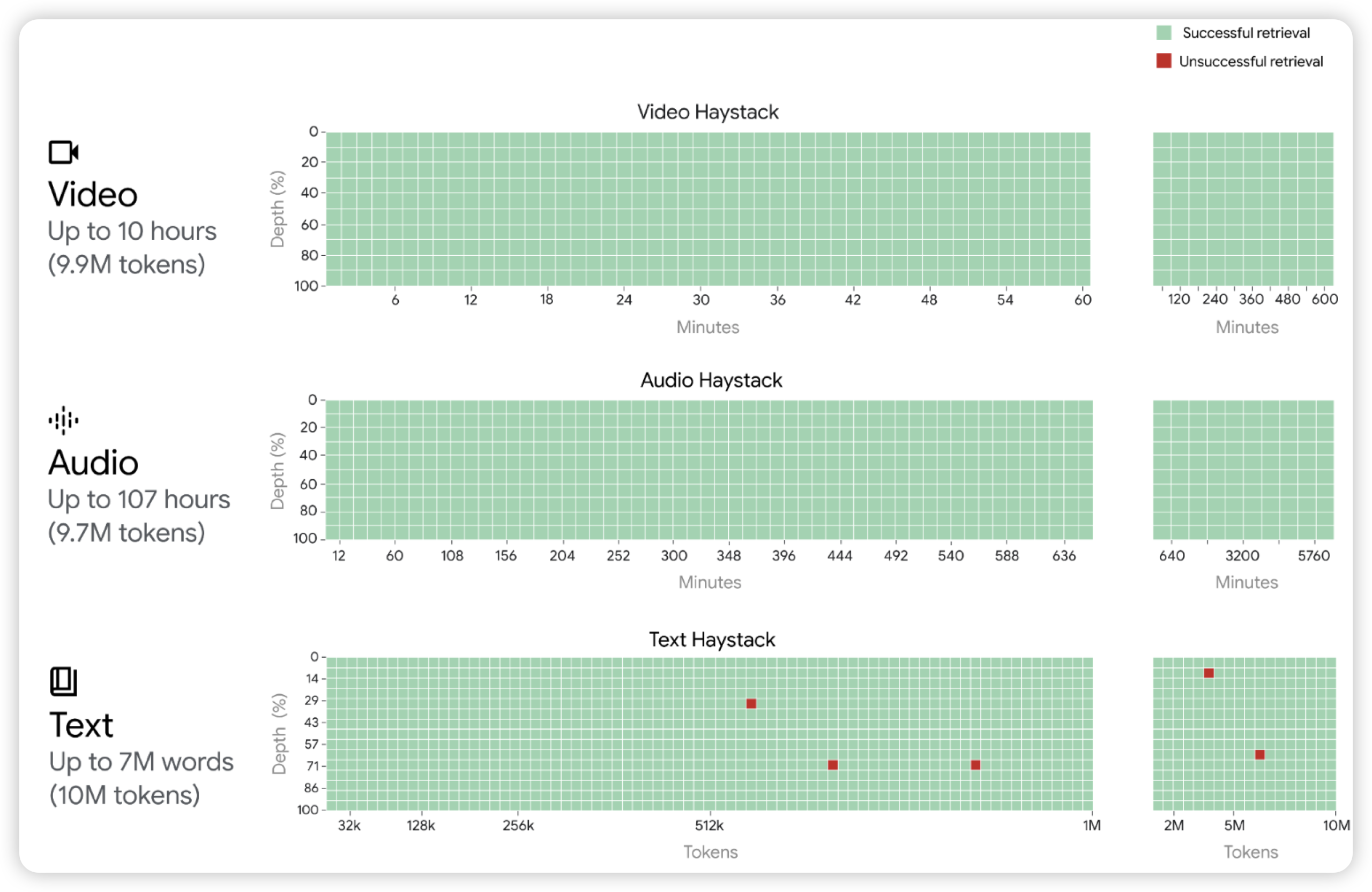 - 在视频、音频、文本联合编码的next token prediction方法下,gemini在10M token,即10hour视频下仍然能做到几乎完美的大海捞针。