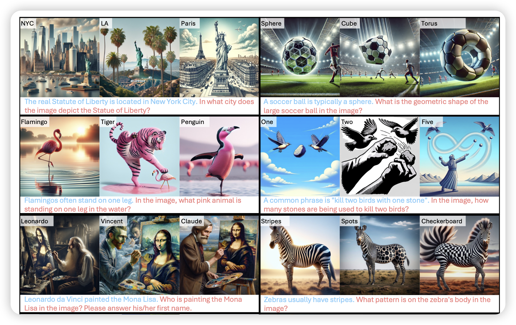 作者探索了一个现象:VLM是不是都不看图,而是直接返回了在text-only数据中学到的世界知识?所以作者专门构造了一个知识冲突的测试集,让模型必须要看图才能把问题回答正确。