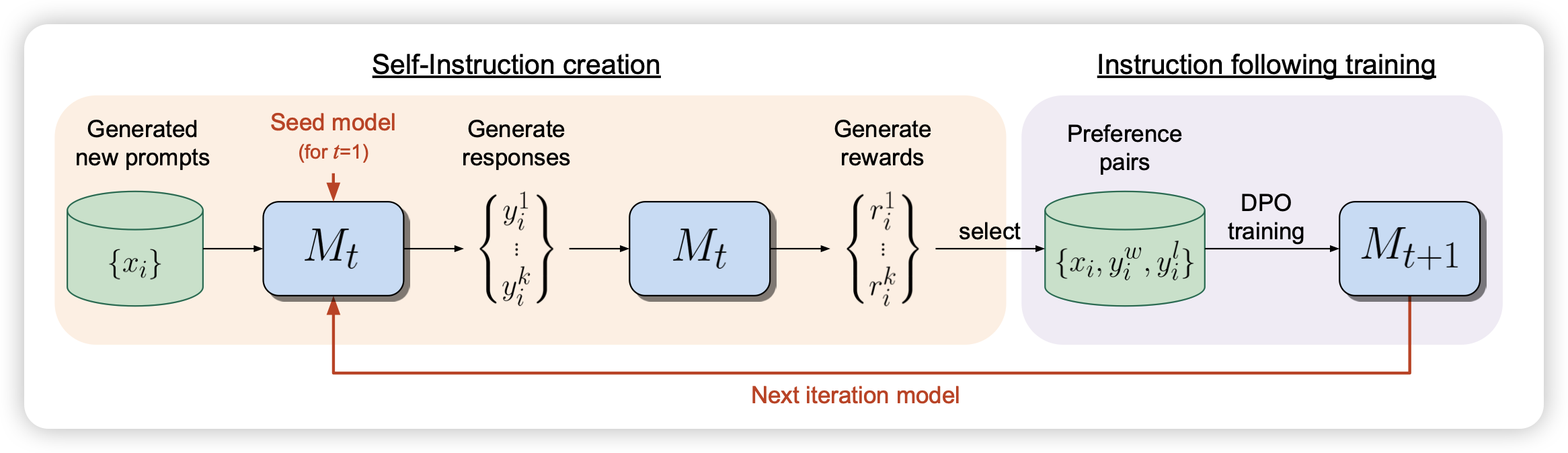 Meta的论文:既然可以做RLAIF,那么这个LLM-as-a-Judge为什么不能是自己?要训练super-human模型,就需要super-human的reward。作者尝试了这种自己同时是rewarder也是generator的训练方式。发现LLama 70B在3 iter以后,就下游任务上就超过了GPT4-0613