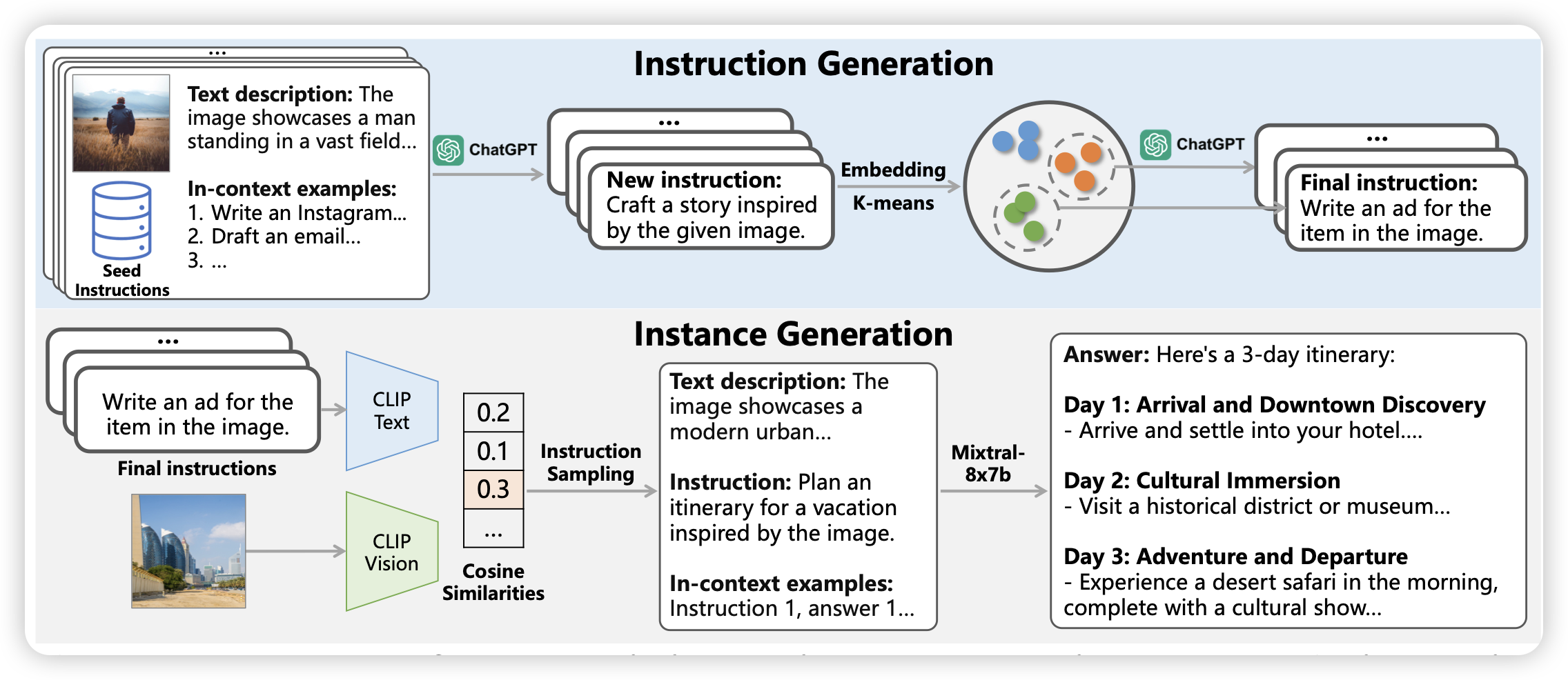 作者搞了一套机造VLM SFT数据的机制,还挺有意思的:会根据k-means做平衡,同时为了解决self-instruct领域在VLM中需要额外condition on image 的问题,作者先生成抽象的instruction,再根据clip embedding找到类似的图片过来适配实际的instruction。用这种方式,作者构造了个SFT数据集。