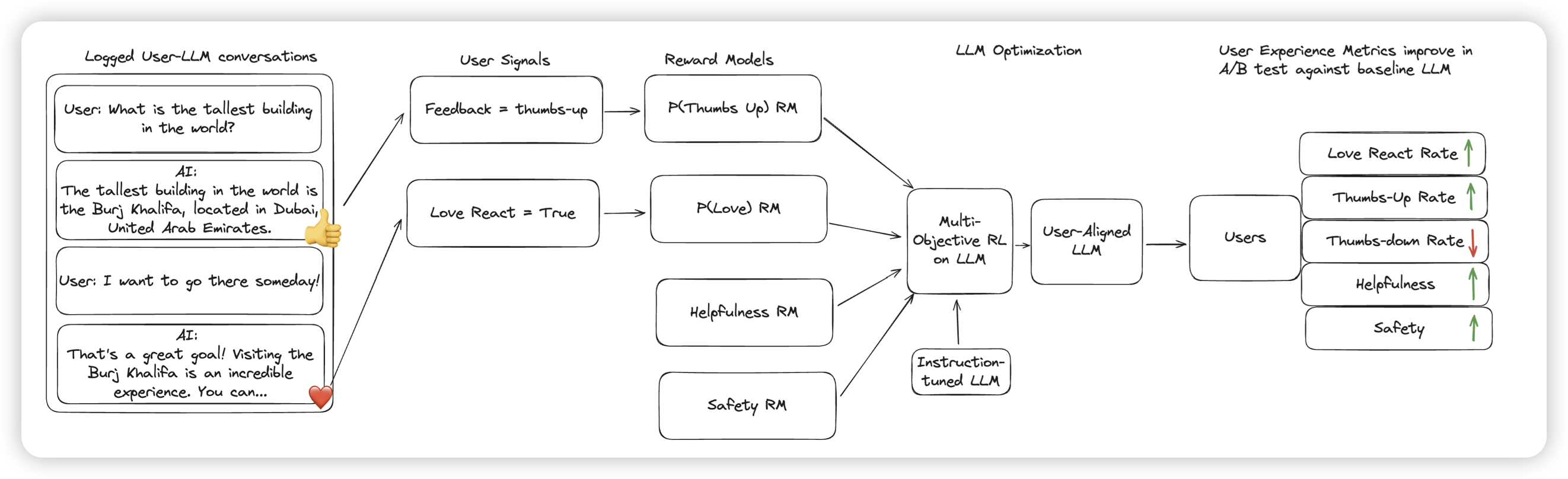meta的工作,作者还是研究了那个老问题:能不能从真实世界的多轮对话的user-response里,提取到对模型回复水平的reward?但区别是,作者不在toy setting,而是直接在realworld setting上做。训了一个二元分类器,对用户回复进行分类(作者把好回复叫做love response)。在做了rl以后,在A/B test上,提升了28%的love-response比例。同时,作者发现了一部分的reward hacking现象
