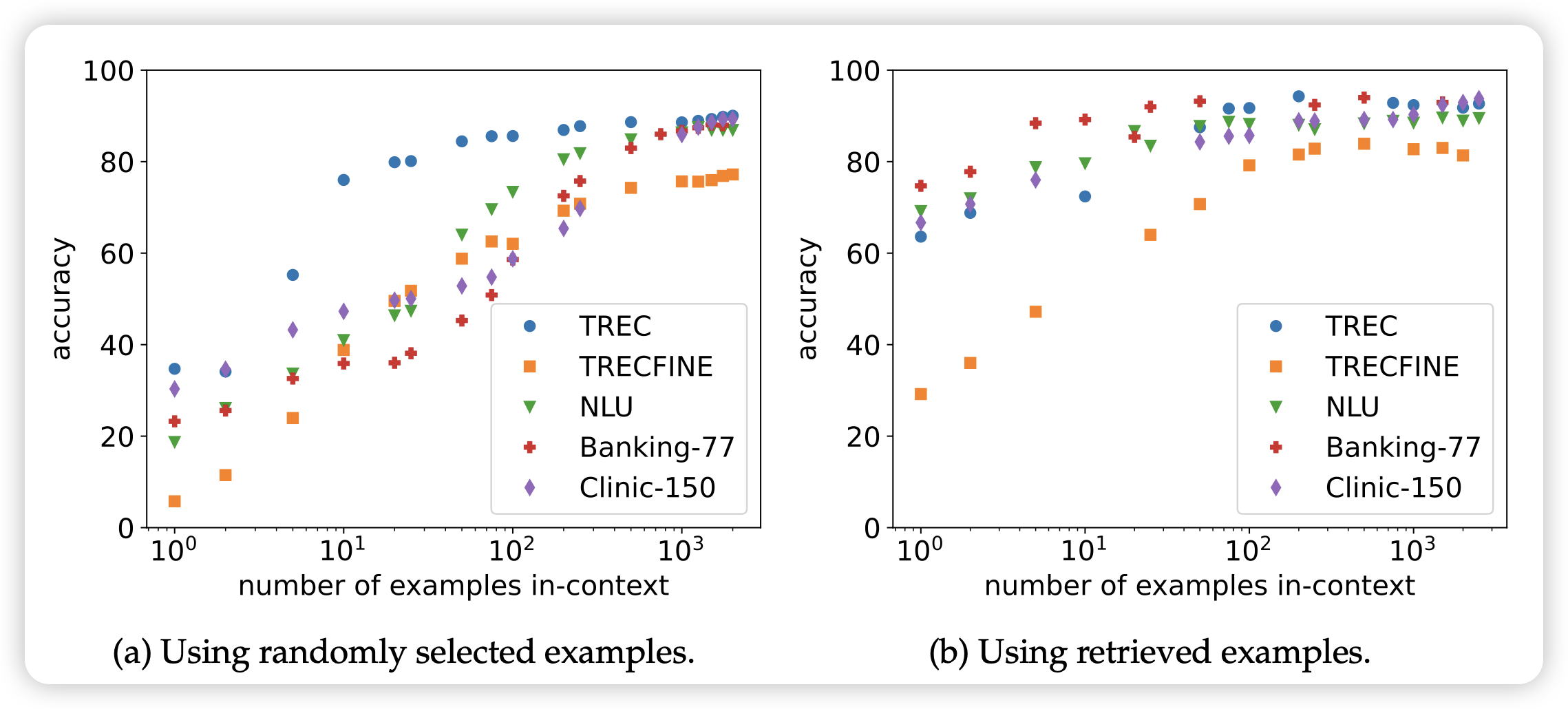 neubig的论文,被上周的manyshot icl抢发了。类似的思路:目前的模型已经是sequence length 128k了,能不能来一个1024-shot learning?作者发现: