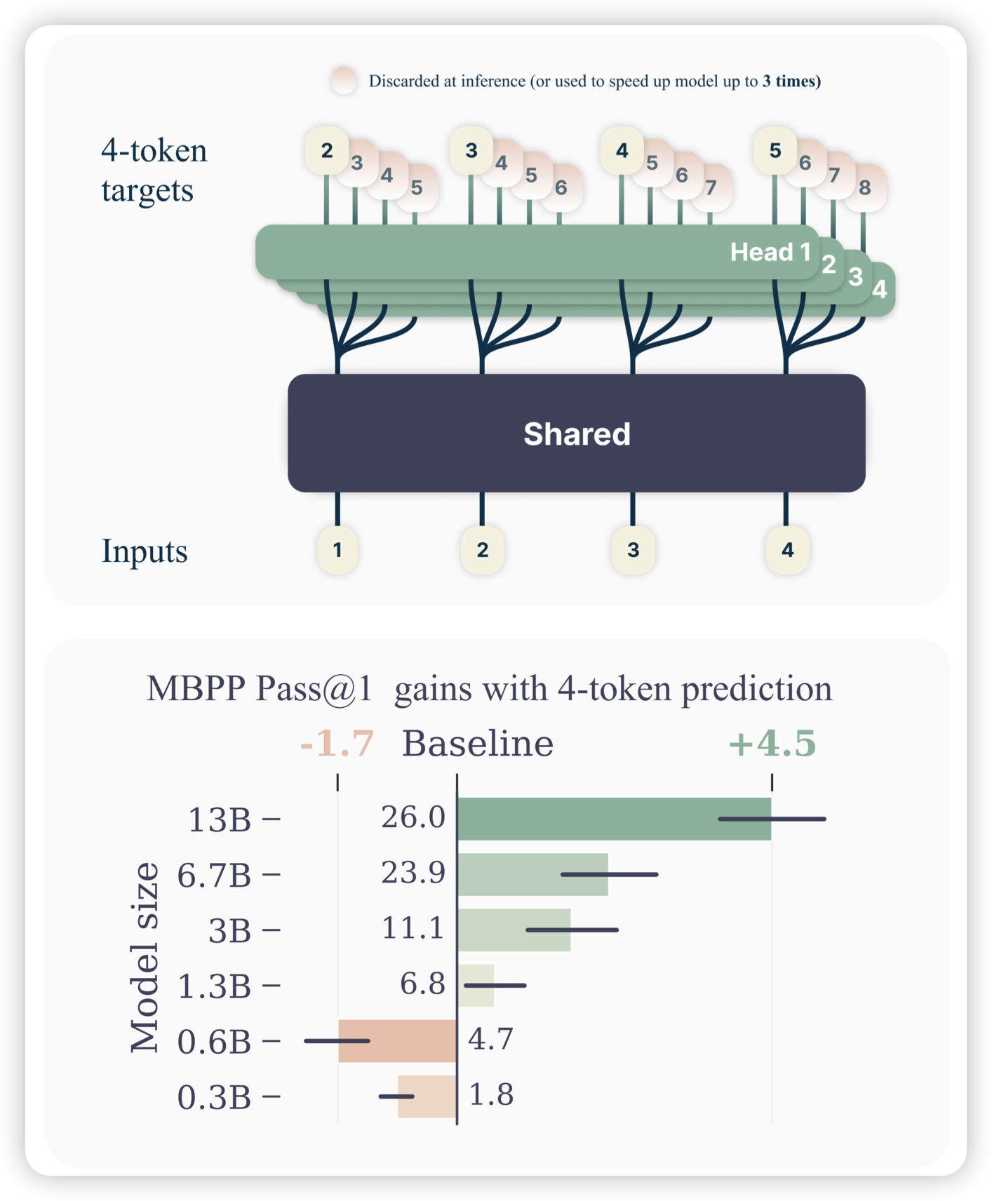 Meta的论文,作者发现目前的GPT系列都是next-token-prediction,每次预测下一个Token的logits。作者在想,如果一次预测未来n个Token,速度会加速吗?所以作者把模型结构改成了,前面是share的部分,从某个部分开始变成了n份,分别预测未来的n个token。发现这样训出来的模型当参数量起来以后,效果并不差,同时速度非常快。