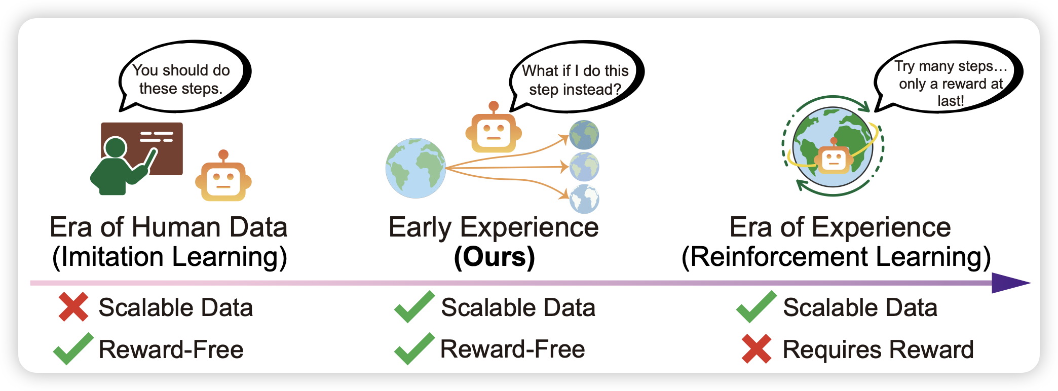 作者发现:正常的rlvr需要准确的reward,但这个东西其实并不scalable,而且需要做很heavy的、带环境的rollout才能获取一次reward。但是实际上,和环境的交互本身是不是有价值呢?作者认为,agent traj中产生的每一次环境反馈都是有意义的,如果模型能预测这些东西,可能对完成任务有帮助。作者发现,直接通过rollout+预测env的模式,就可以让模型提升表现,或者说提升接下来的真正rl阶段的潜力
