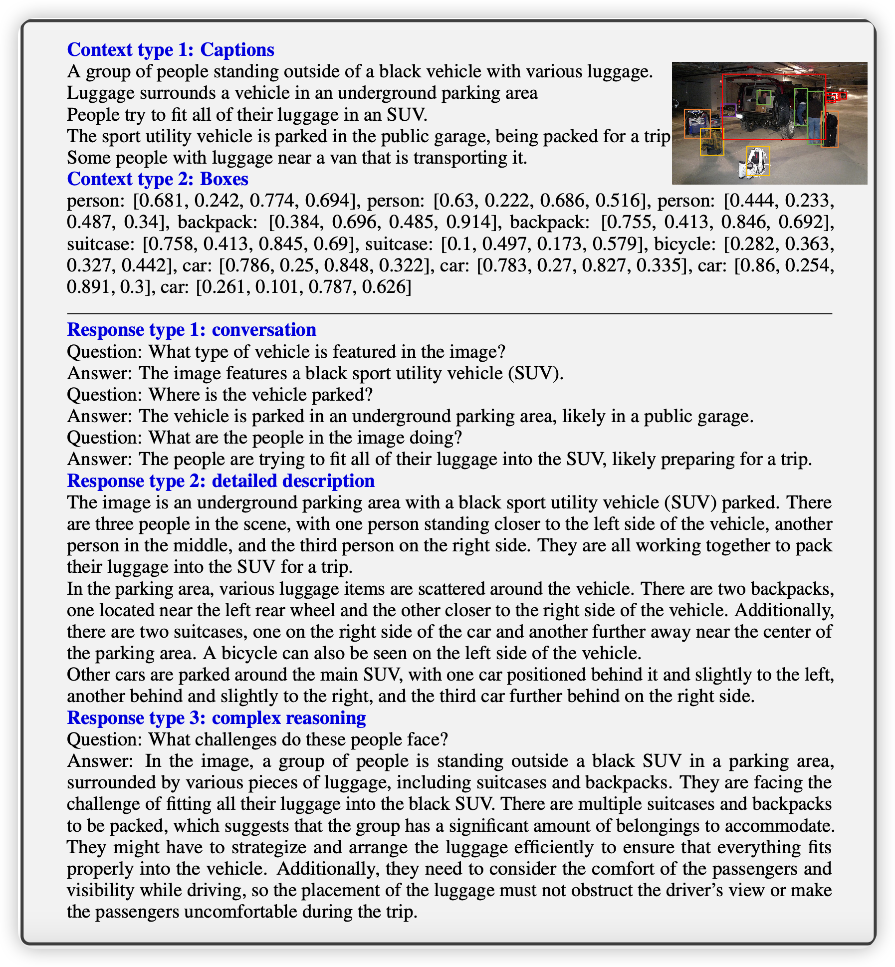 LLaVA的作者对上面的思路做了一下梳理,构造了一个数据集。里面所有的数据的格式都是类似于下面这样 \[ X_q X_v<STOP>\text{\\n Assistant} : X_c <STOP>\text{\\n} \] 其中最前面会有一个图片,然后会有一个问题,接下来是回答。总体是多轮对话形式的。作者定下了三种数据类型,共158K数据