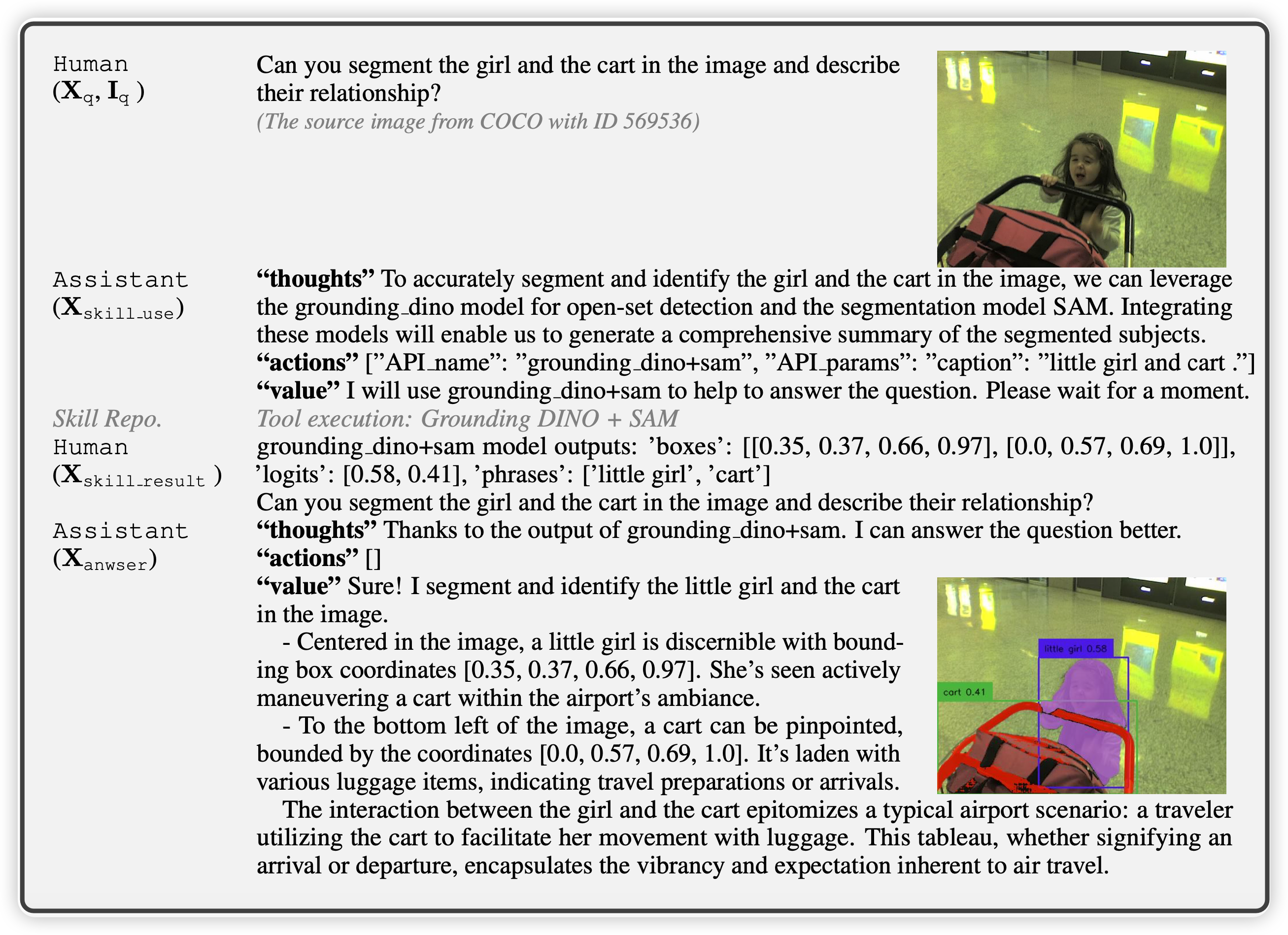 训出来的模型基本都是按照这种形式。可以看到,传入的图片基本上是一个原图,加上一些的形式bounding box,然后几种数据格式在表现上就是对话。作者在训练的时候,只有answer的部分是有loss的。
