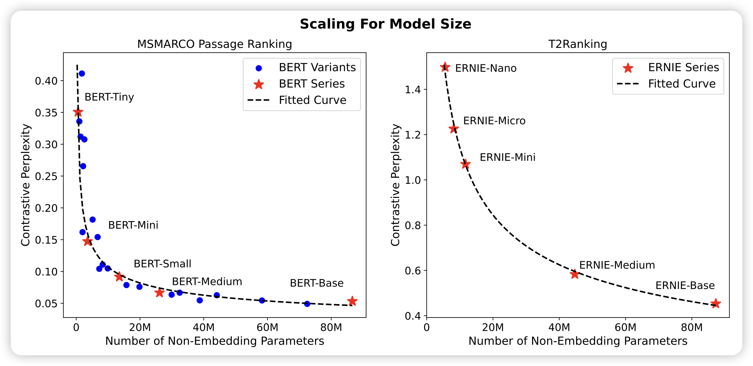 刘奕群老师的文章:探索了对于dense retrieve任务,也存在scaling law吗?作者用constrastive ppl观察曲线,发现还真是:模型参数增长、训练数据增长都是符合scaling law的。最后,作者探索了在固定budget下如何分配模型参数、训练数据,来取得最好的效果