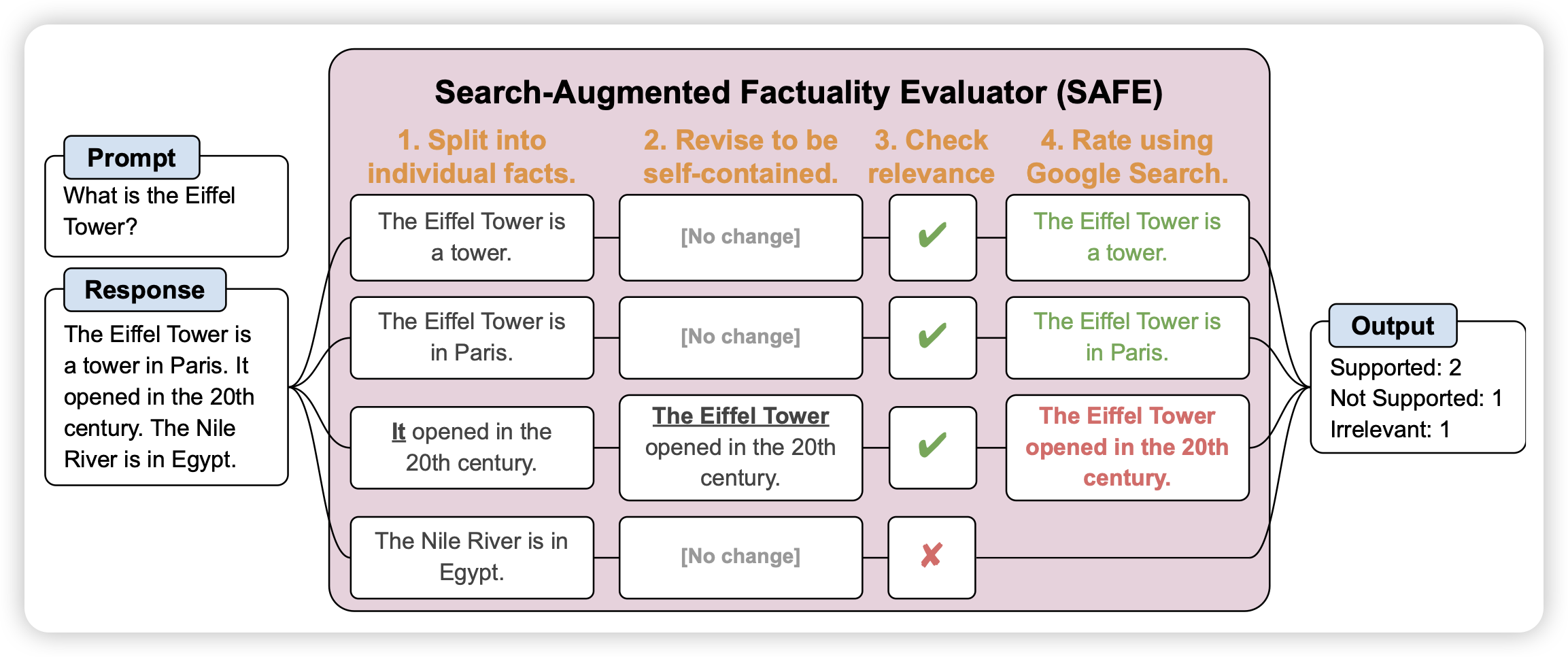 deepmind这两天的推特顶流论文:作者探索了LLM来自动检查文本中有没有事实性错误。首先把repsonse划分成了多个fact,然后逐一去google检查正确性。作者发现,LLM自动检查的方式和人类有70%一致性,对于不一致的情况,有75%的情况下human错了而LLM是对的。
