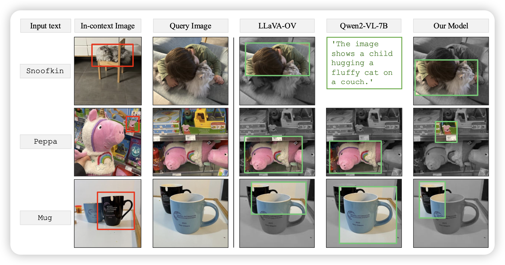 一篇挺聚焦的文章,作者关注的是:模型能否根据上下文图片里的som框,认出来想要grounding什么东西,并且在新图片上做grounding呢?显然,没训练的模型都不行,作者finetune过的模型做的还挺好。