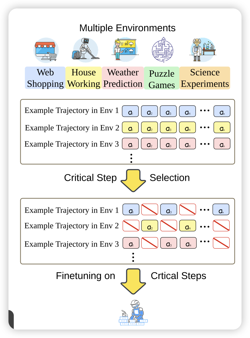 这篇工作也挺有趣的。作者提到了一个叫key step的概念,就是说agent sft数据里,对完成任务最重要、最需要推理的一些step,发现在critical step上加loss,只用30%的数据训练可能就足够了。
