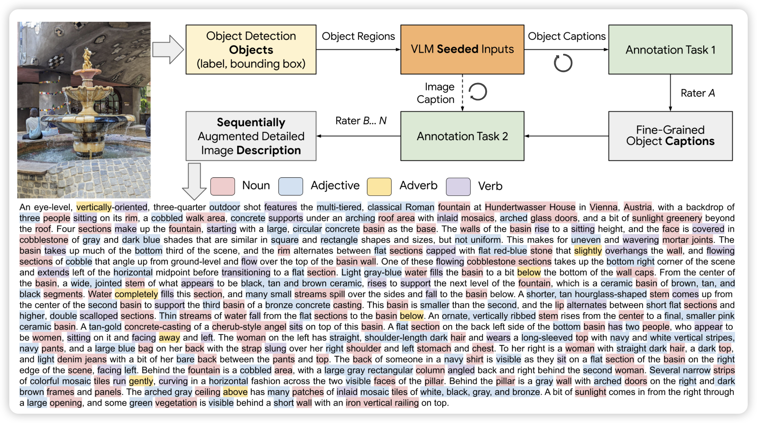 Google的论文,作者发现目前所有的image caption数据集都不够高清、不够细节。作者设计了一套pipeline,结合多种object detection模型之类的方案,让human辅助标注,最终可以快速生成非常高质量、非常高清的image caption。作者发现,通过这种方案训出来的VLM模型,比正常的模型效果好非常多。
