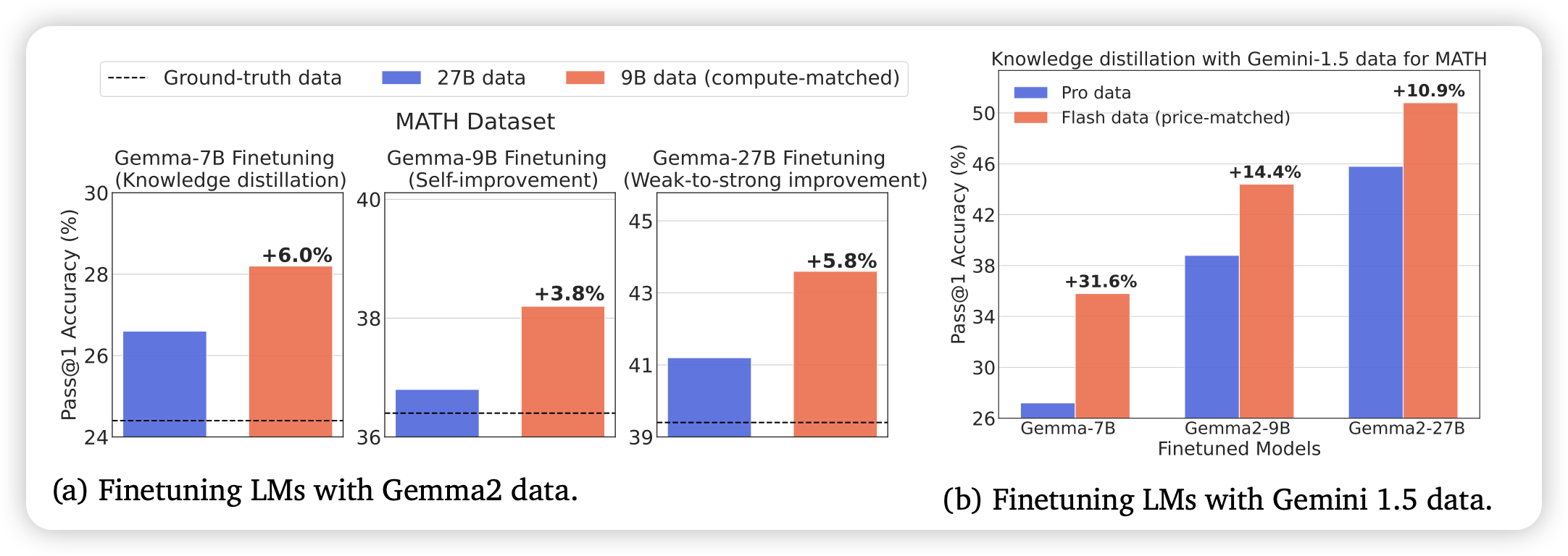 Deepmind的工作:作者探索了一个问题,现在大家都是搞合成数据。但是用什么模型合成呢?大模型的数据质量高但是贵,小模型的数据质量低但是便宜。如果,按照flops公平对比,标注相同flops的合成数据,改用大模型合成还是小模型合成?
