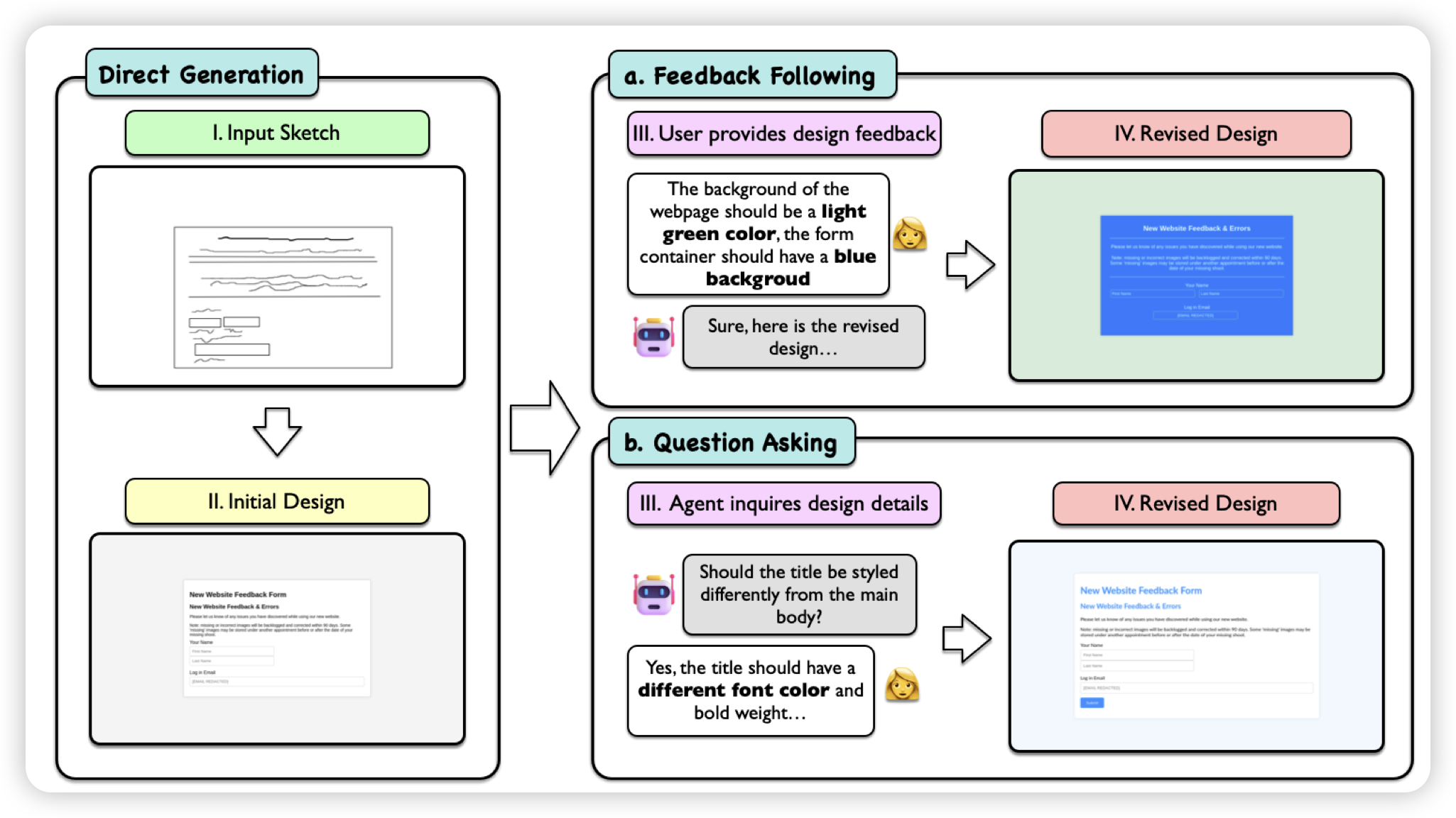 一篇挺好玩的前端生成的benchmark,作者设想了一个交互式的场景:用户最开始提供了一个草图sketch,然后可以在生成过程中持续地提供意见指导,评测最后的效果。作者发现,多轮对话和feedback对于生成好的网页至关重要。