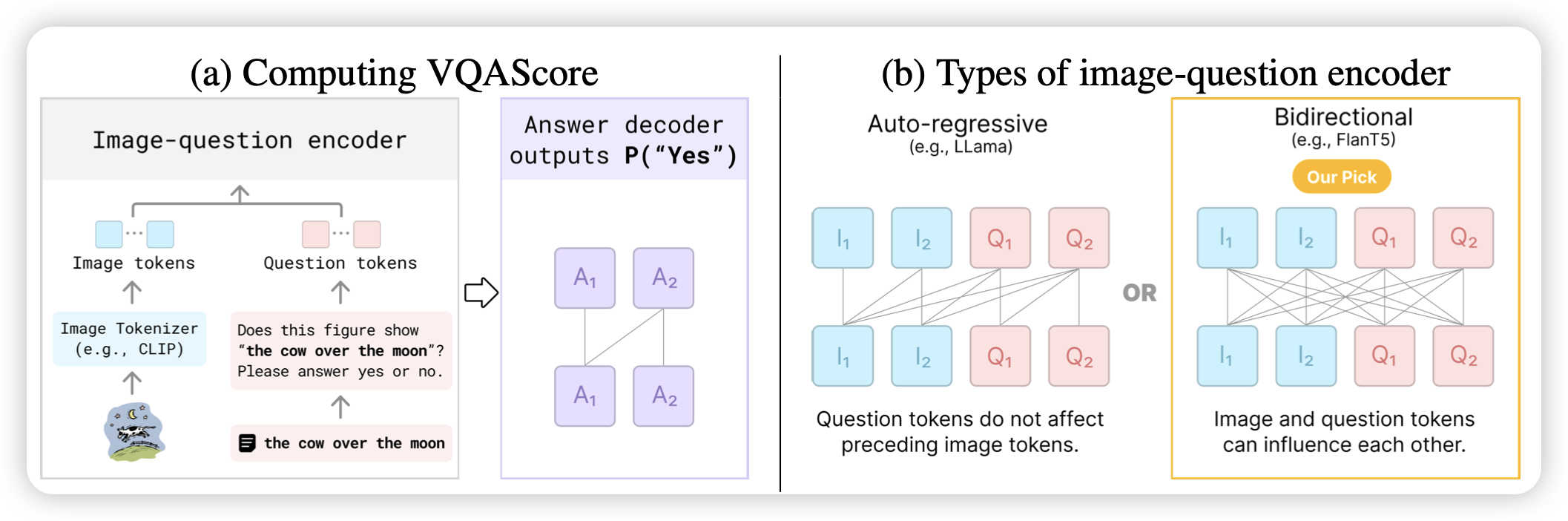 Neubig的论文。作者发现目前text2image大家还是再用CLIPscore做评测。CLIPscore效果很差,毕竟是双塔。作者想,现在大家VQA模型都这么好了,能不能用VQA模型的"yes" logits做评测呢?答案是可以,并且效果巨好。