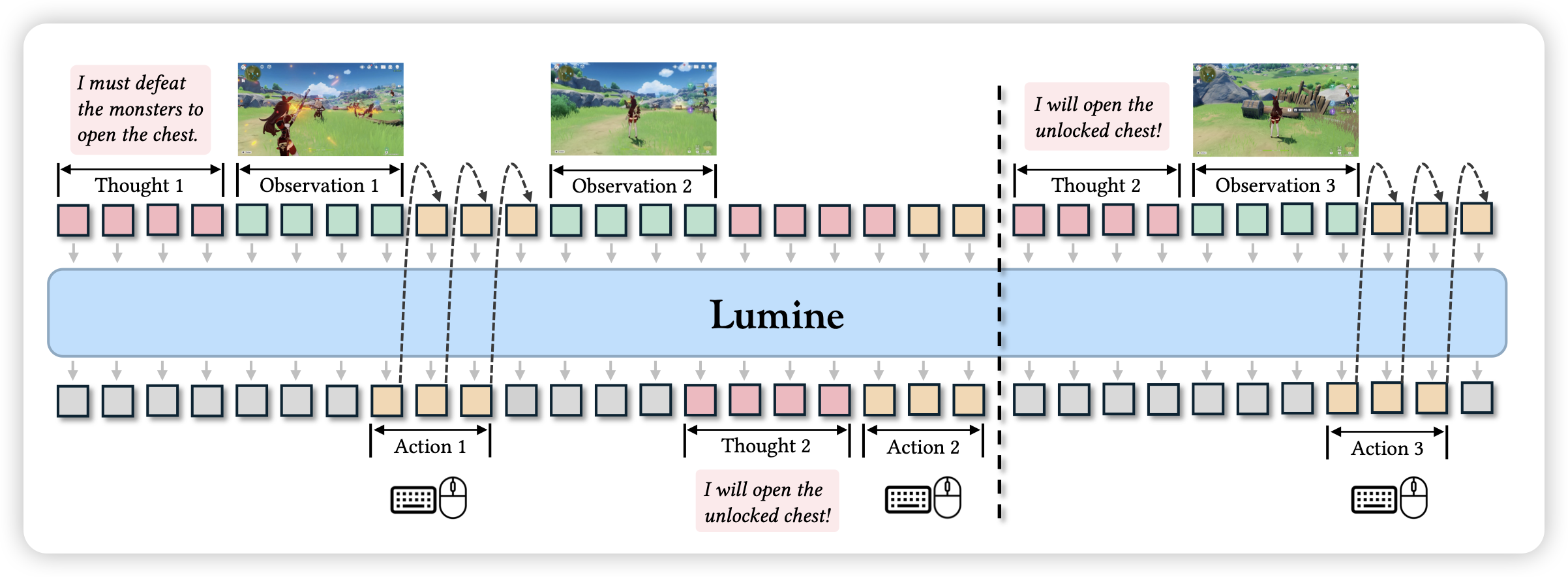 隔壁组的工作。之前我们做了一个比较偏Minecraft的工作,这次这篇更专精原神。使用raw action space,让game model通过数据驱动的模式理解原神游戏。并且通过adaptive think的模式进行操作,也就是说:不再有react类的回合制概念,模型自己在遇到困难时才思考