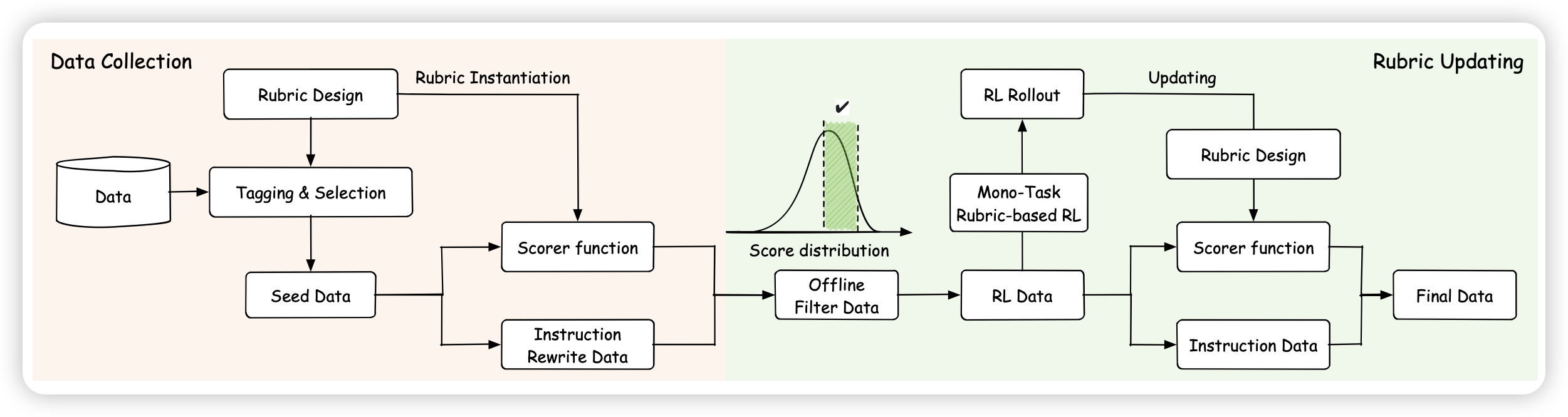 这是一篇通用领域rl的工作。作者想要把reasoning rl这套搬到非rlvr领域。但是该如何verify任务正确性呢?作者找标注员和模型去一个个任务写评价标准,让模型根据标准给答案打分,以此做了一个rubric-based训练集。