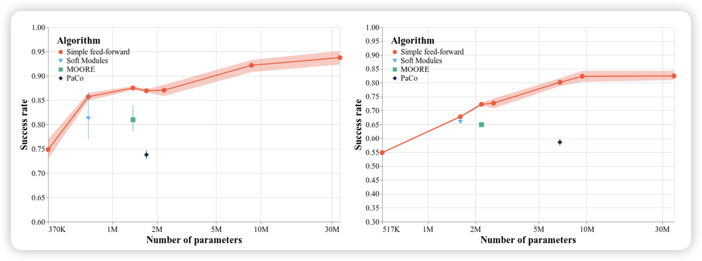 这篇工作挺有意思的,之前有个multitask rl领域,是指用一个模型同时在一堆setting上训,可以把更大参数的模型训起来。与之对应的是,单独一个setting时,scaling模型参数是不会让效果上涨的。作者探索了一个问题:训起来更大的模型,是因为算法更好了,还是原来的老算法单纯加参数就有用了呢?作者发现,其实算法更新没用,老算法单纯加参数,几乎能获得100%的增量收益