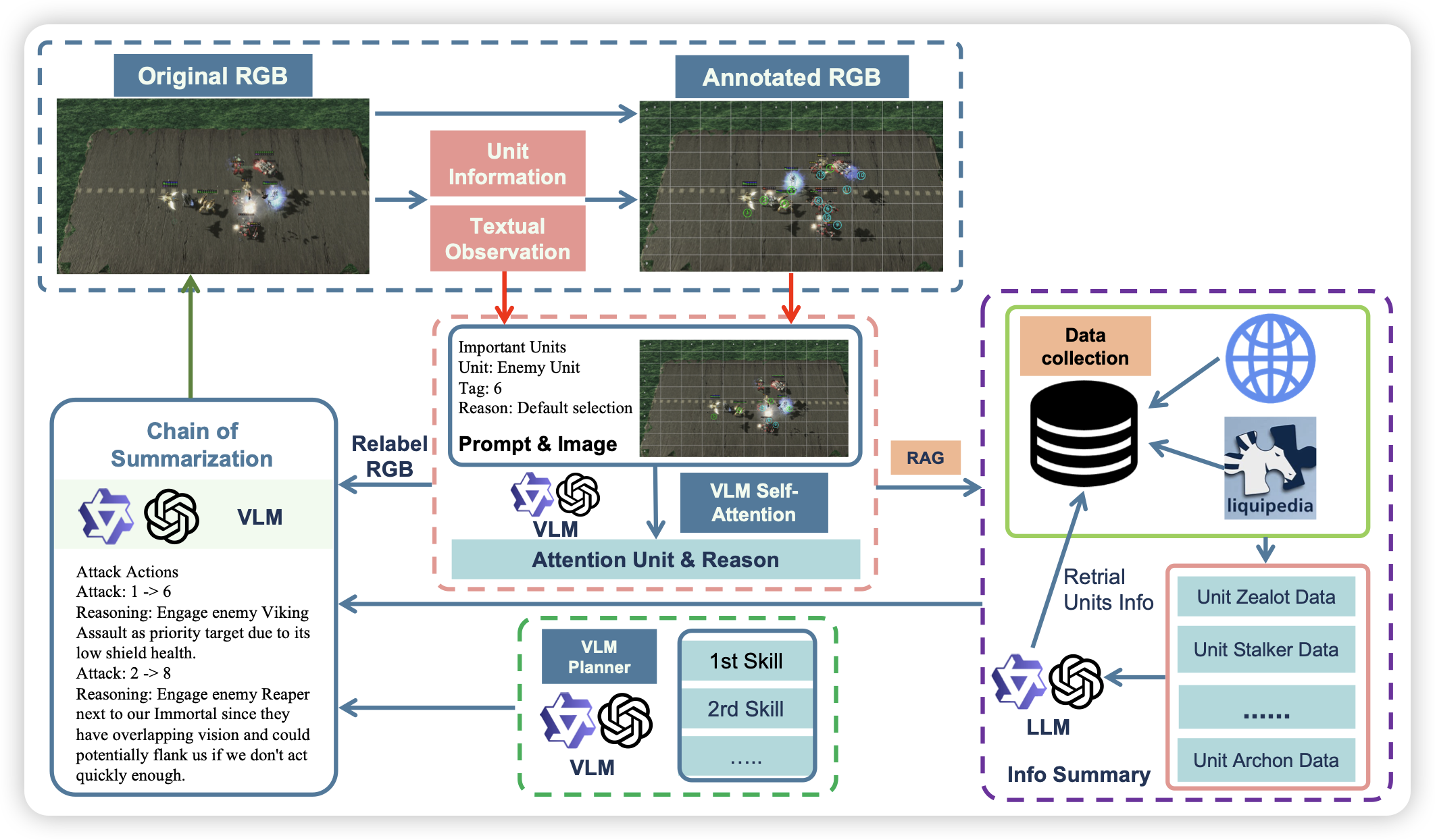 从3.7玩pokemon到manus玩2048,感觉VLM+Game会成为今年的下一个热点。作者这次对starcraft做了封装,产生了对VLM比较友好的som形式的数据集,另外外接了知识库,做出了一个比较好封装的测试、训练框架