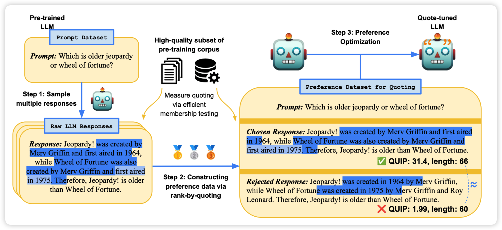 作者提到, LLM生成的内容,往往需要验证是否来源于可信的训练数据。然而这个验证很困难,作者想了一个怪招:让模型生成和训练数据尽可能符合的n-gram。预设模型生成的和某条数据一致的n-gram就是在"引用"某个训练数据。由此获得了一个三步的方案: