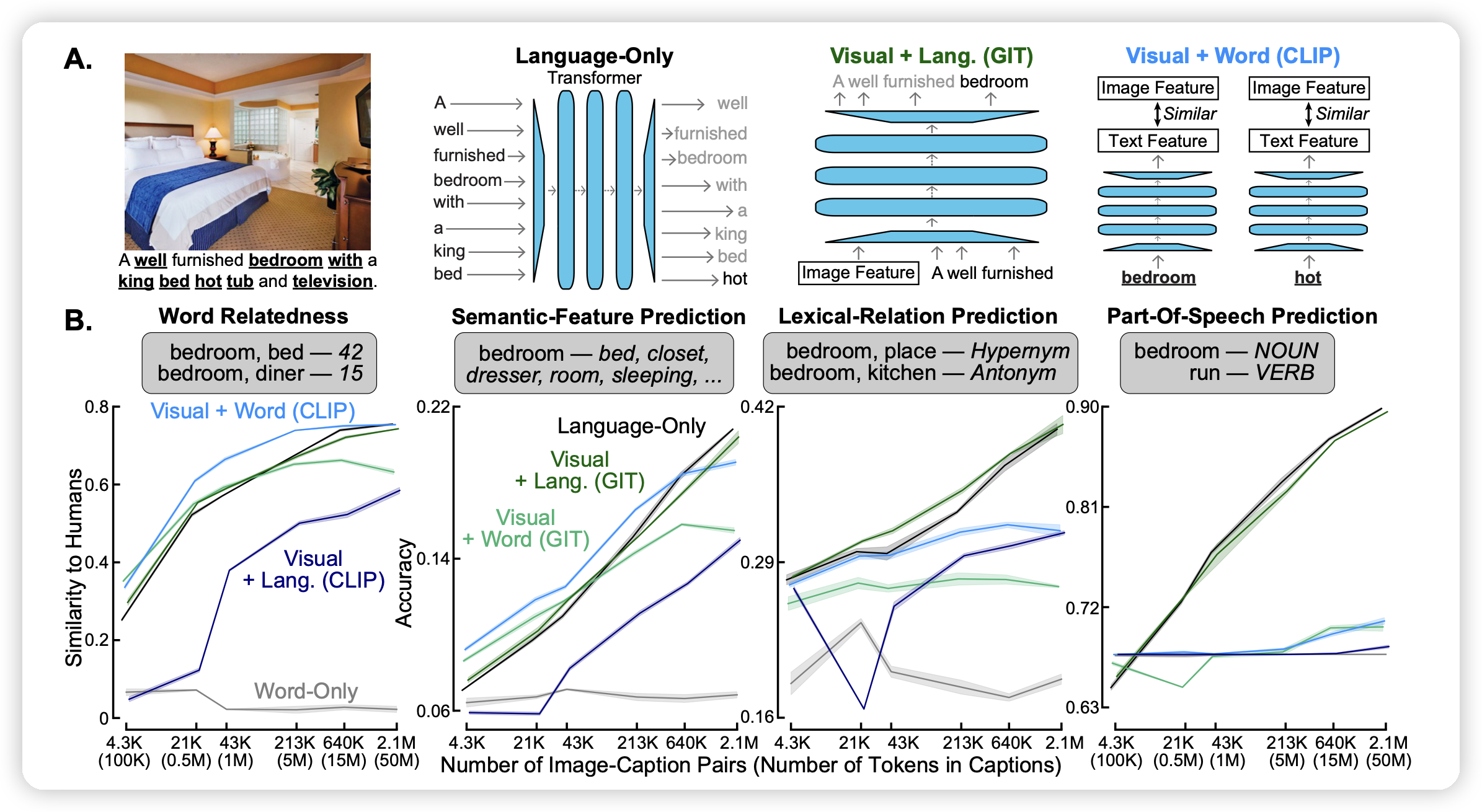 作者提到,目前的语言模型只在文本上训练next-token-prediction,语义里的概念元组没有和真实世界对应起来。作者尝试了一个word-learning,和人类一样从简单的word开始和真实世界里的图片对应起来(embedding-similiarity),再去做预言模型的训练。