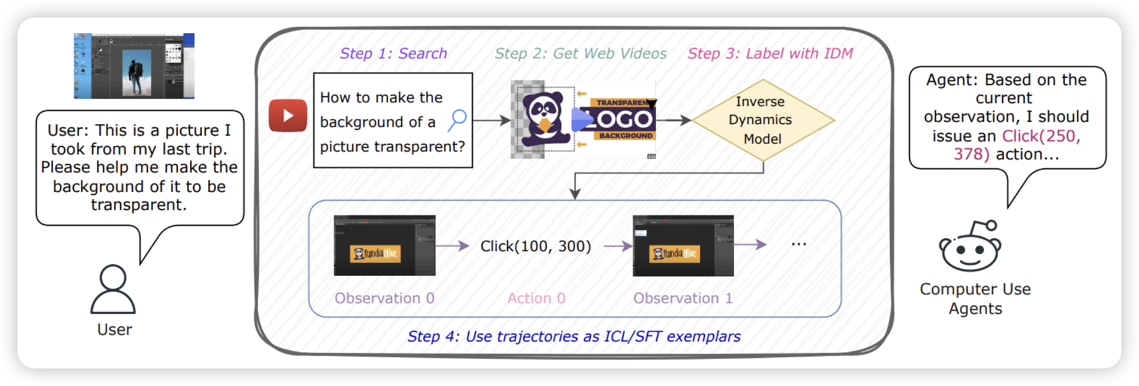 Tutorial-based GUI Agent领域的一篇新工作。但这篇工作里,作者训了一个IDM模型(就是VPT里那个idm),让模型自动从视频里抽取action,由此把视频转化成学习信号更充足的image-text-interleave数据。然后在测试时,训练模型去看着教程来做相似的题目