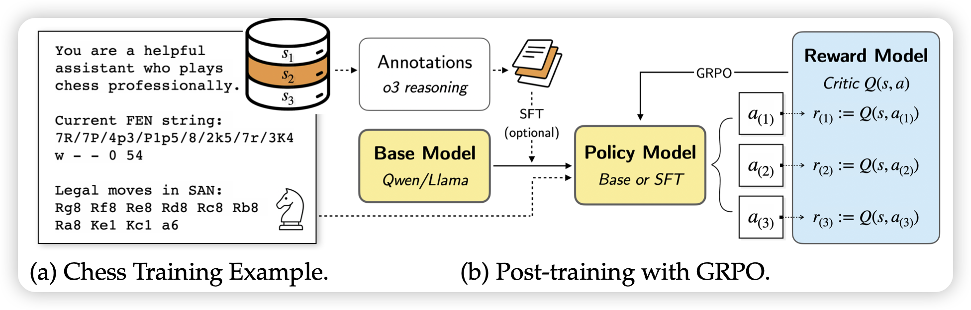 作者在chess场景做了rl,然后甚至用一个state value model去给出更高精度的反馈来提升训练鲁棒性。然而,作者发现模型总是在一个较低的水平收敛,没有发现更深层次的strategy。作者认为这个基模能力带来的,靠rl很难去发现新策略