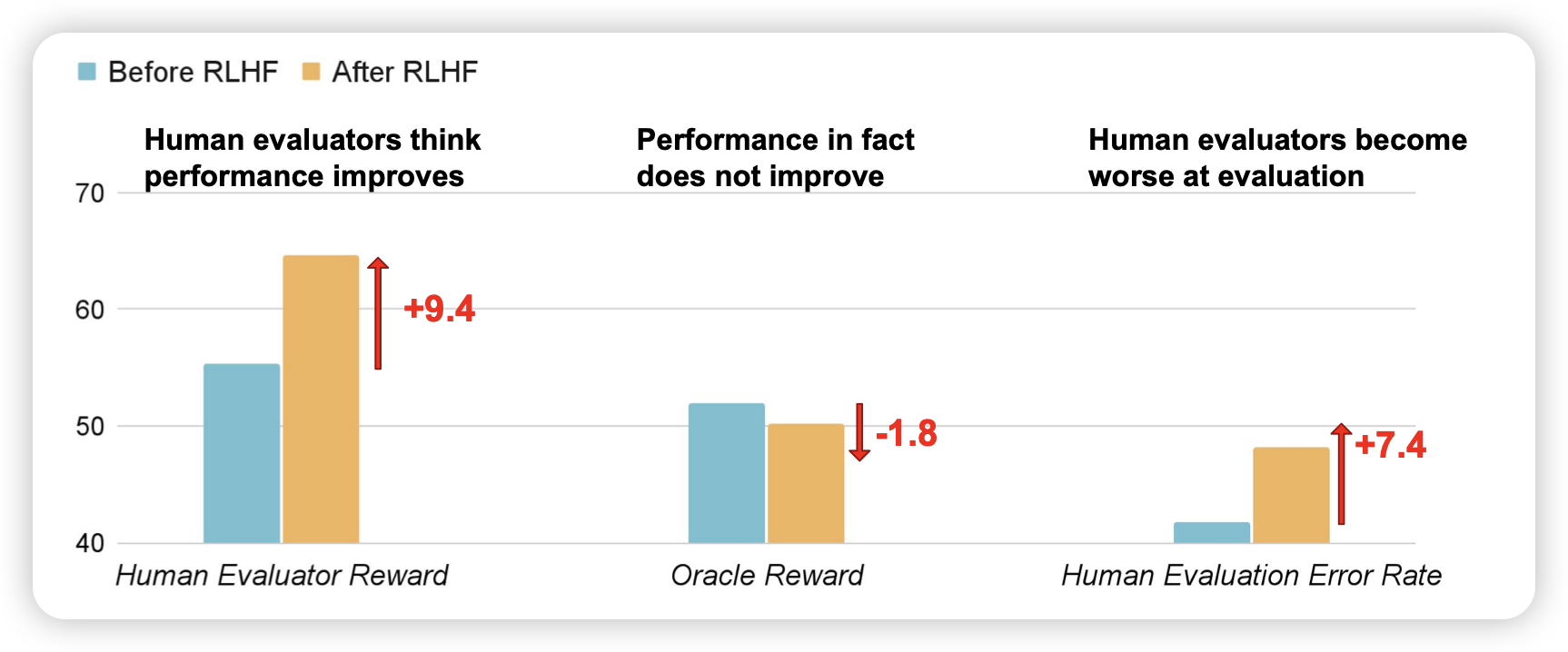 作者发现了一个好玩的现象:在rlhf以后的模型,学会了怎么样说服人类,即使本身的准确率没有提升,但人类更难发现模型输出中的错误了。