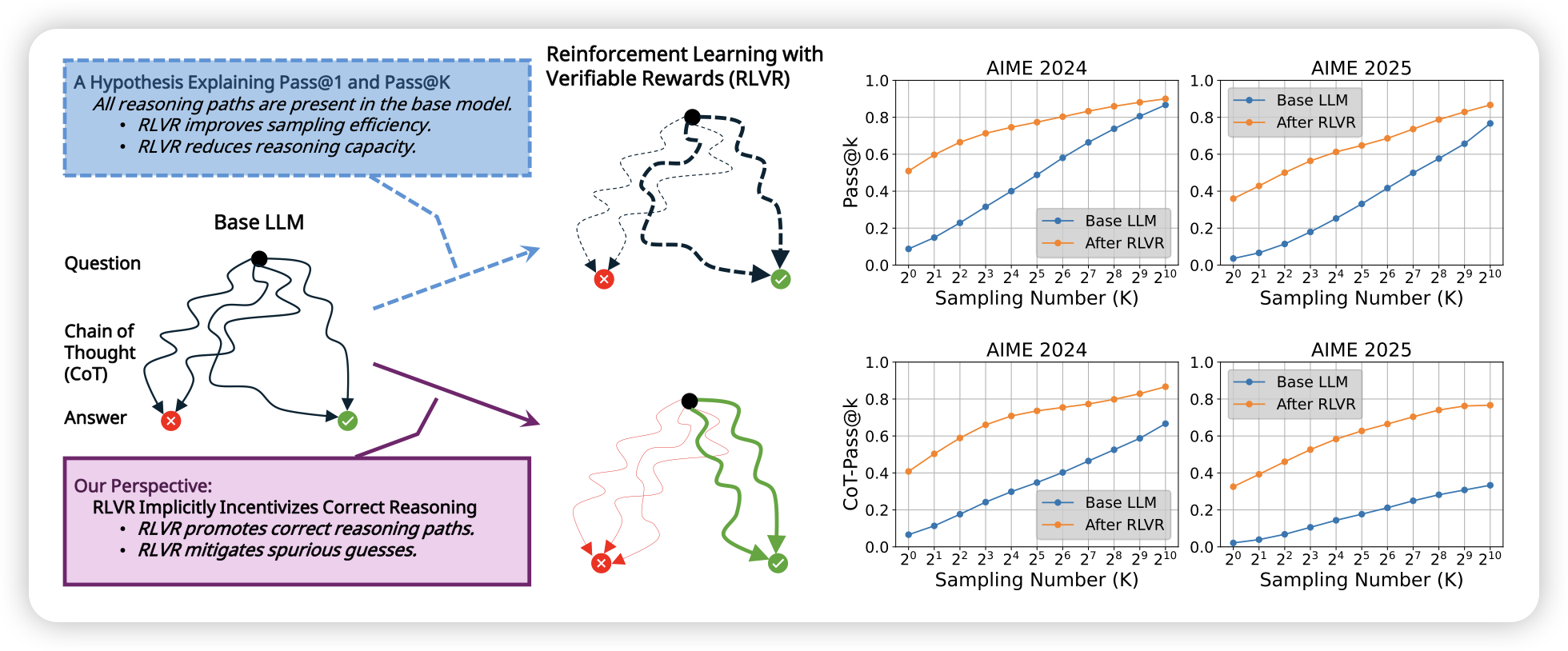 这篇工作是对之前一个工作的回击:之前有篇工作发现,RLVR并没有使得模型的bon提升。这篇工作指出了一个关键问题:bon这个metric本身是有问题的,因为bon的答案很可能是假阳(答案正确,但思考过程错误)。作者用另一个llm verifier检查thought是否有错误,发现如果考虑这个因素的话。新产生的metrics,训练了rlvr后是大大提高了