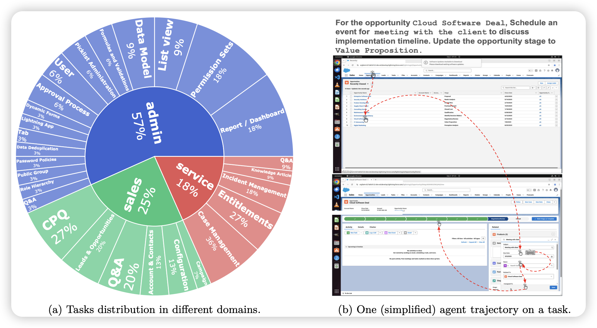 在OSWorld之后,其实也出了不少osworld-like benchmark:考验cua的某个方面,给了func-verifier,几百题这个规模。但今天saleforce的这篇确实算是质量高的,作者瞄准的是enterprise-task,可以func-verifier。还有个叫做demonstration-augmented setting,让模型先看人类的演示再做题(在这个情况下,一般模型水平会提升50%左右)。