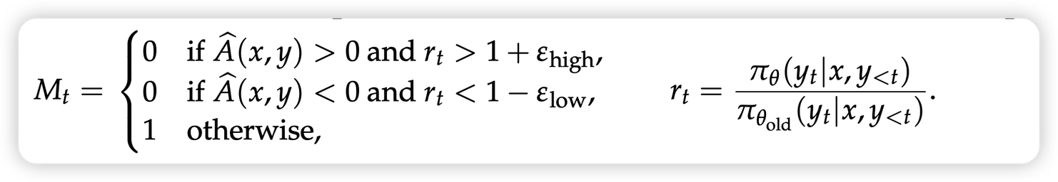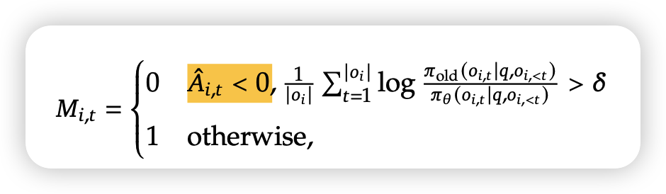 额外防了第三种意外情况:假如一个sequence里所有token平均上,\(\pi_\text{old}\)都很小,那干脆把这个sequence整体clip掉,不参与梯度计算