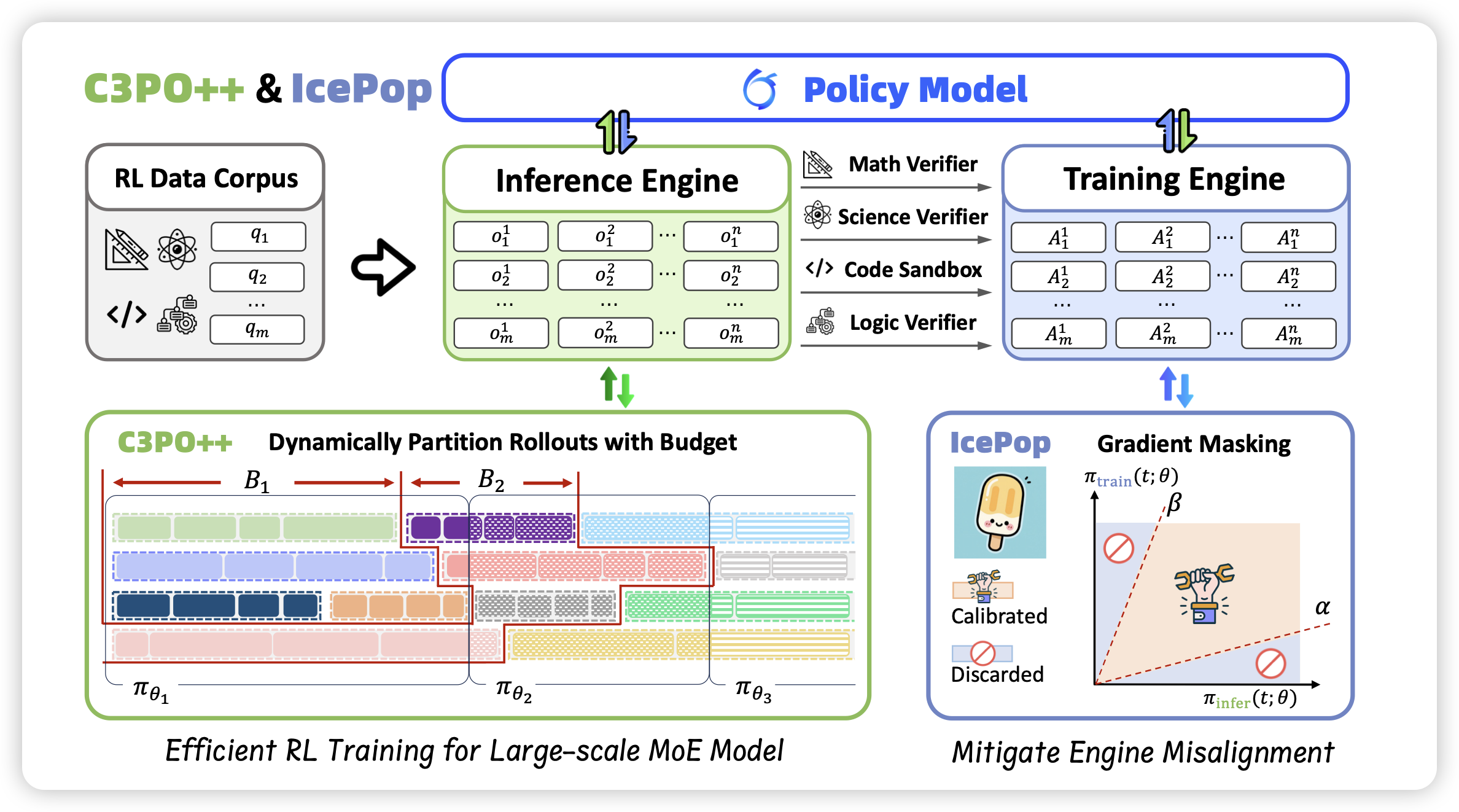 2025-10-22-insights 发表于 2025-10-24 更新于 2025-10-26 分类于 Arxiv-Insights 阅读次数: Valine: 本文字数: 229 阅读时长 ≈ 1 分钟 Every Step Evolves: Scaling Reinforcement Learning for Trillion-Scale Thinking Model 蚂蚁的工作,把1T A50B的模型跑起来了单轮rl。这种scale下的工作,肯定是从数据、rollout方式到训练加速、算法创新都有的一个形态,这篇工作也差不多,可以好好读一读 话说一直比较好奇kimi、qwen、ant他们一直在做的这个1T A50,是同一个新基模吗…这个基模本身的credit最后被分给哪个组了 相关文章 本月更新(Recent Update) arxiv-insights 2025-10-23-insights 2025-10-21-insights 2025-10-20-insights