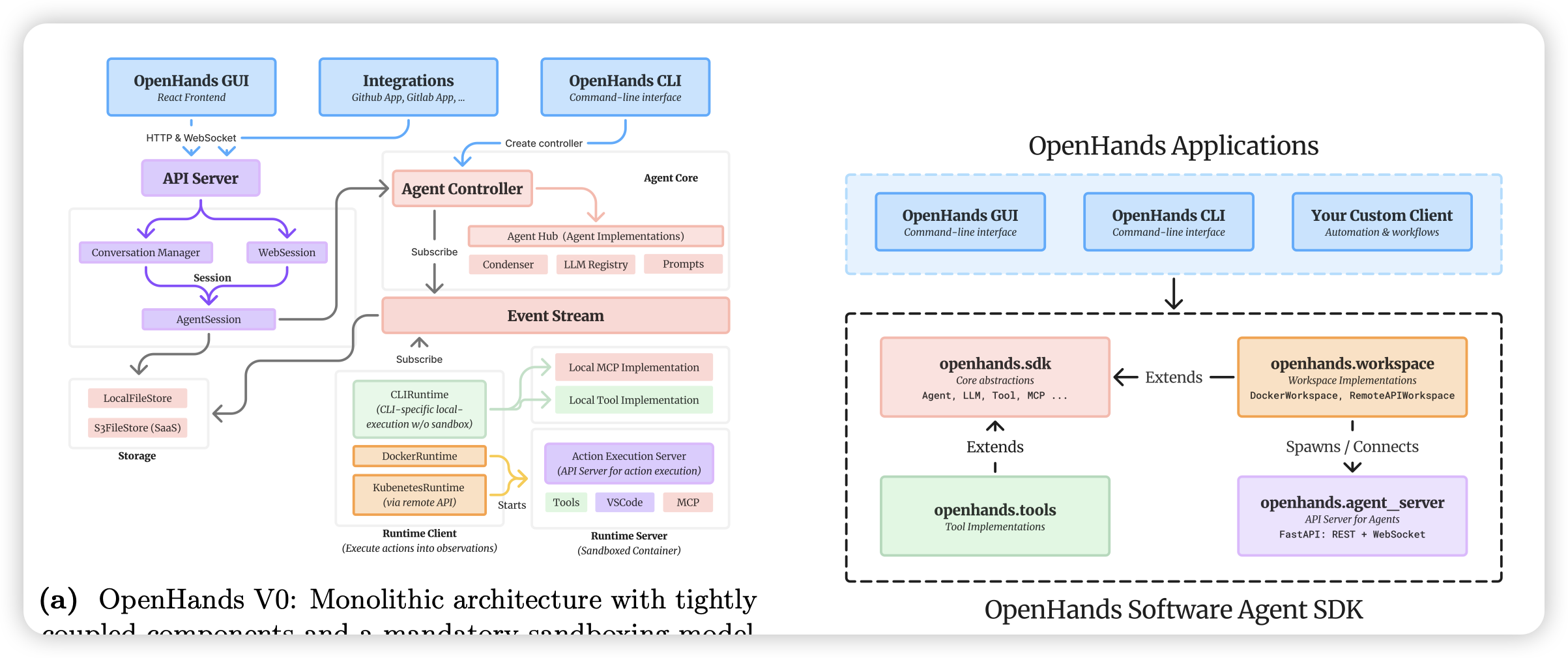 openhands团队把代码重构了,改成了v1版本。主要是把agent、tool、env解耦了,这样工业界用openhands的人,和学术界魔改算法的人互相不冲突