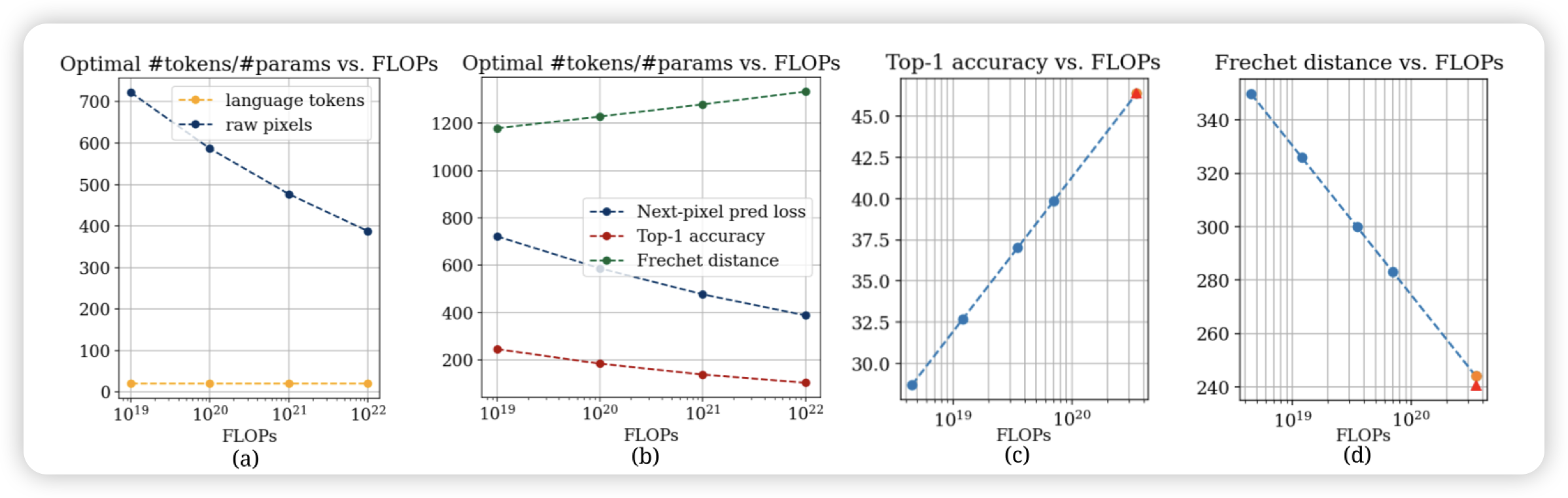 作者在各种模型参数量、训练数据量、训练flops上开展的了实验,发现了一个反直觉的结论:现在模型效果不好,并不是因为训练数据量不够,而是因为模型参数量不够大。想要做ntp的图片生成,应该扩展模型参数量